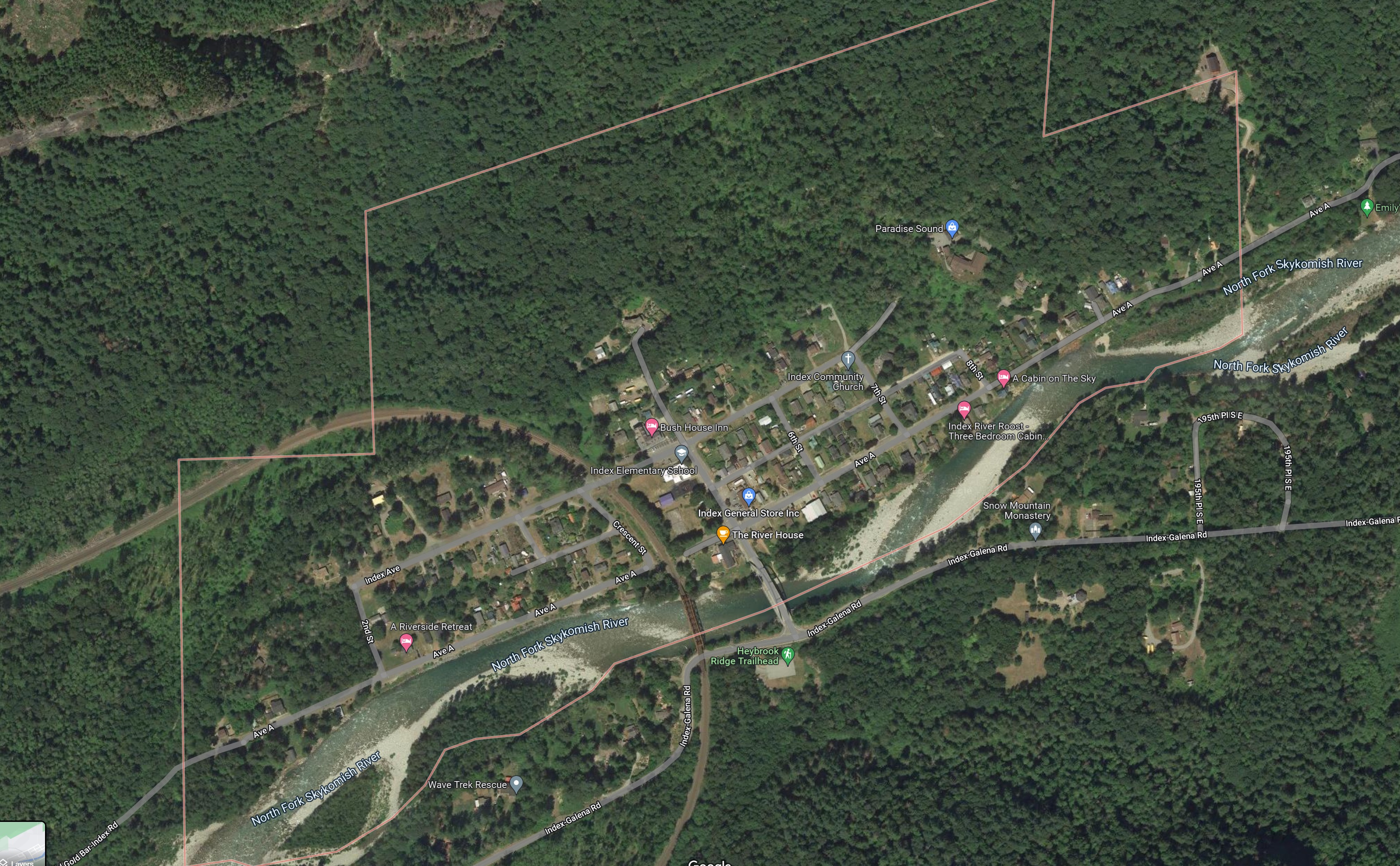 Index is a small town nestled in the Cascades. After crossing the main bridge coming into town, there is a park, a general store, and a few homes. You can see just how small the town is here.