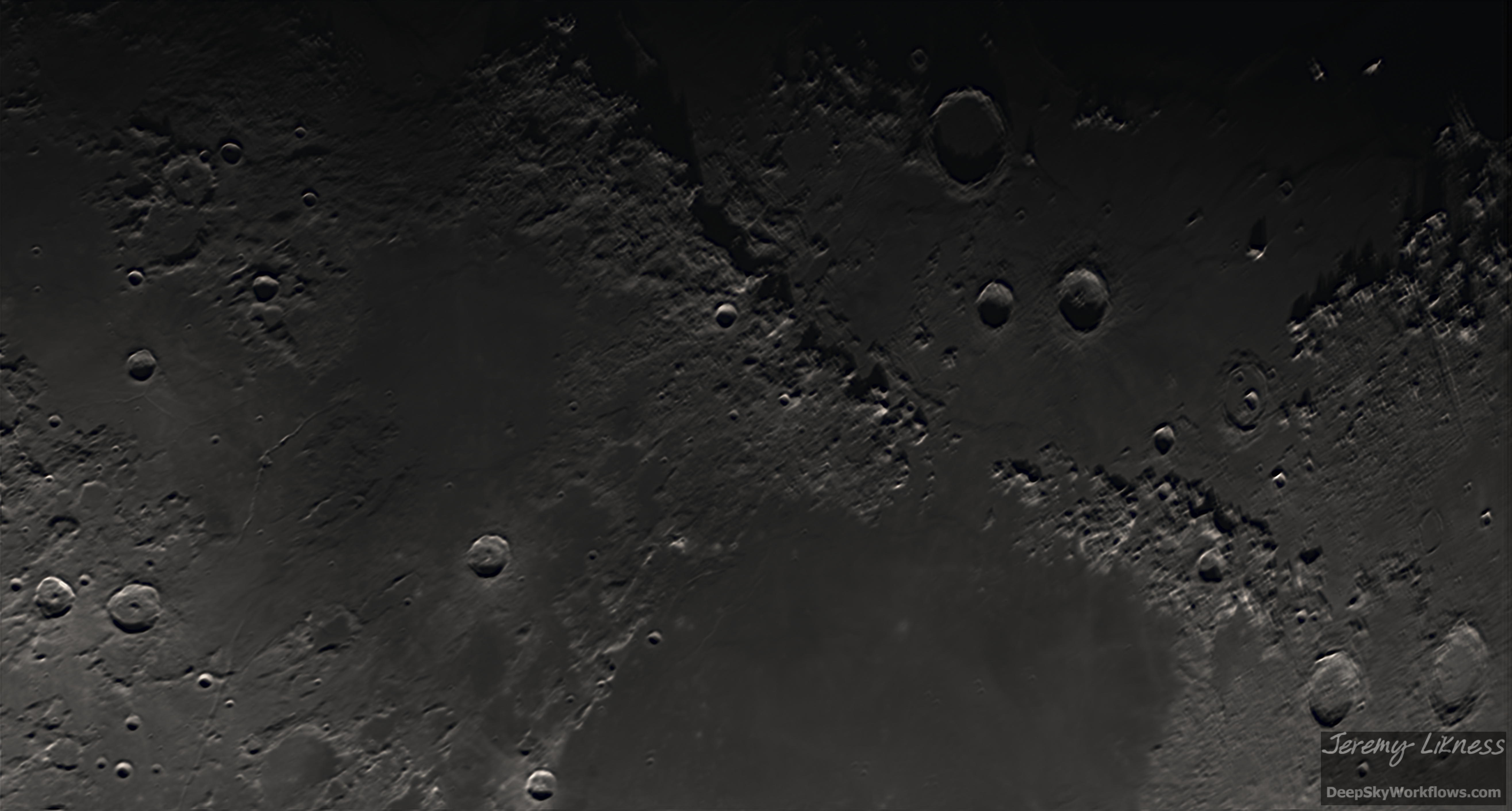 The large crater in the upper right is Archimedes. Below that, an imaginary line from Aristillus and Autolycus pointing towards the center of the image will land just north of the Apollo 15 landing site on the opposite side of the ridge. The break in the ridge is the boundary between Mare Imbrium (top) and Mare Serinitatis (bottom). The left is dominated by Mare Vaporum. The lower right craters are named Eudoxus and Aristoteles.