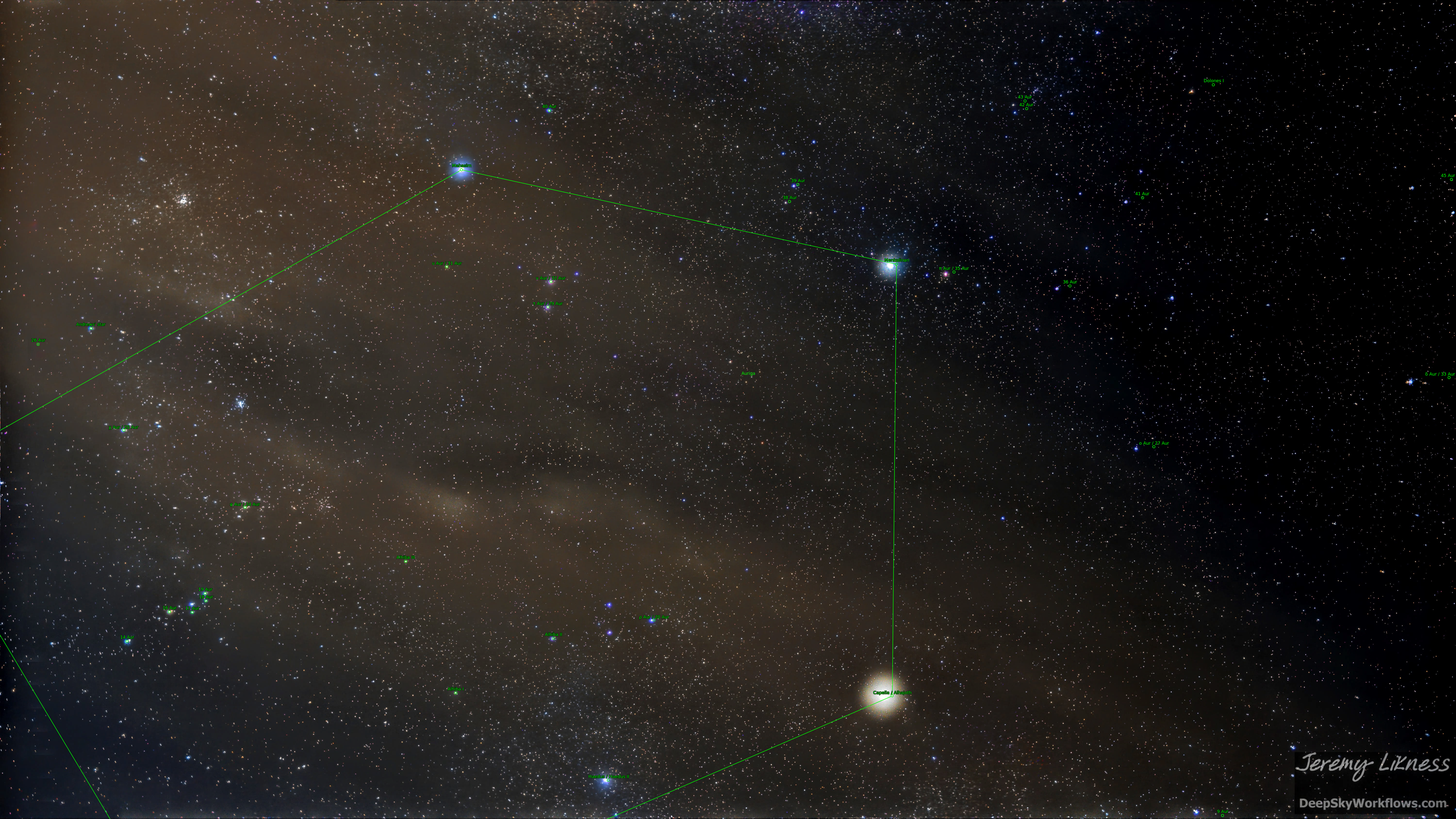 Brilliant Capella is low center in this starfield shot a 50mm with my camera riding piggyback on the main telescope. Blue stars Menkalinan and Bogardus connect with Capella to from the side of the 'modern constellation' Auriga that means 'Charioteer.' To the left is the string of star clusters (M36, M37, and M38). The blue stars to the lower left mark IC405, the Flame Nebula (not visible at such a short exposure).