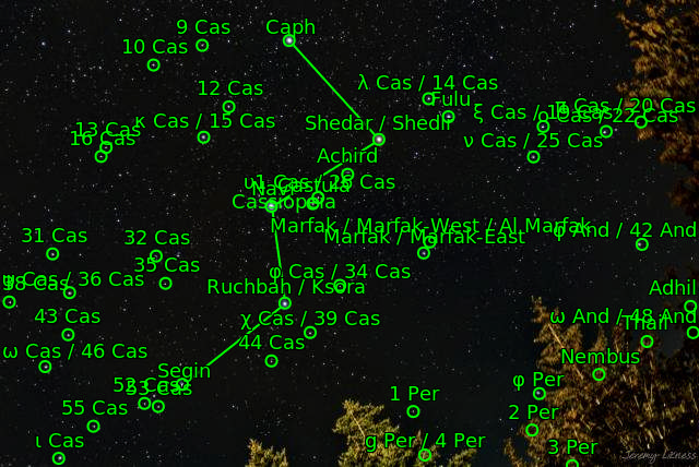 11 Cas 15 Cas 17 Cas 18 Cas 24 Cas 27 Cas 37 Cas 45 Cas Ksora (δ Cas) NGC281 Shedir (α Cas) The constellation Cassiopeia (Cas) The star Achird (η Cas) The star Caph (β Cas) The star Fulu (ζ Cas) The star Navi (γ Cas) The star Nembus (51 And) The star Ruchbah The star Segin (ε Cas) The star Shedar The star κ Cas The star φ Per υ Per