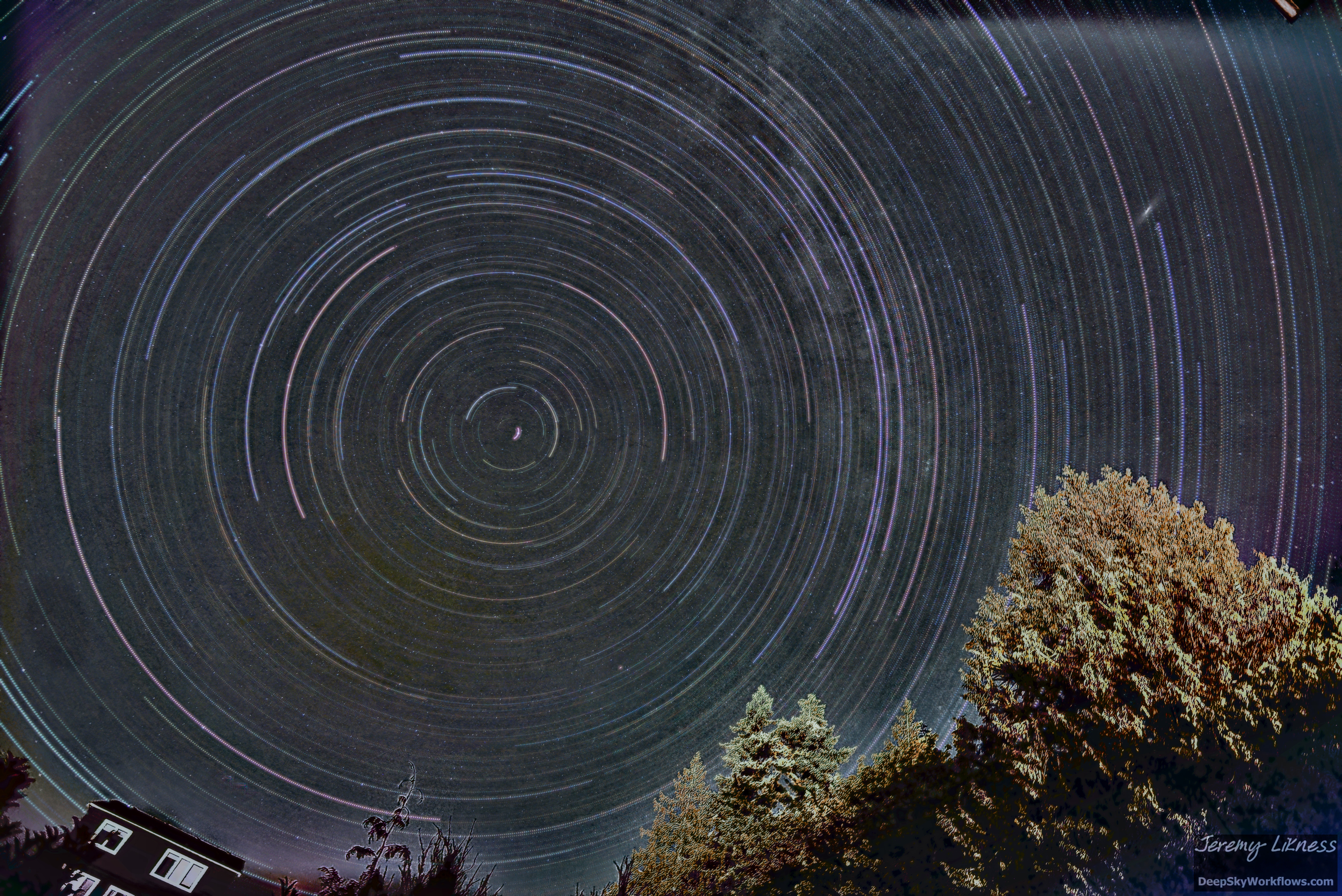 Star trails from a night of shooting the skies to catch a glimpse of the Perseids meteor shower. I superimposed on a single frame so you can see the Andromeda Galaxy on the right side.