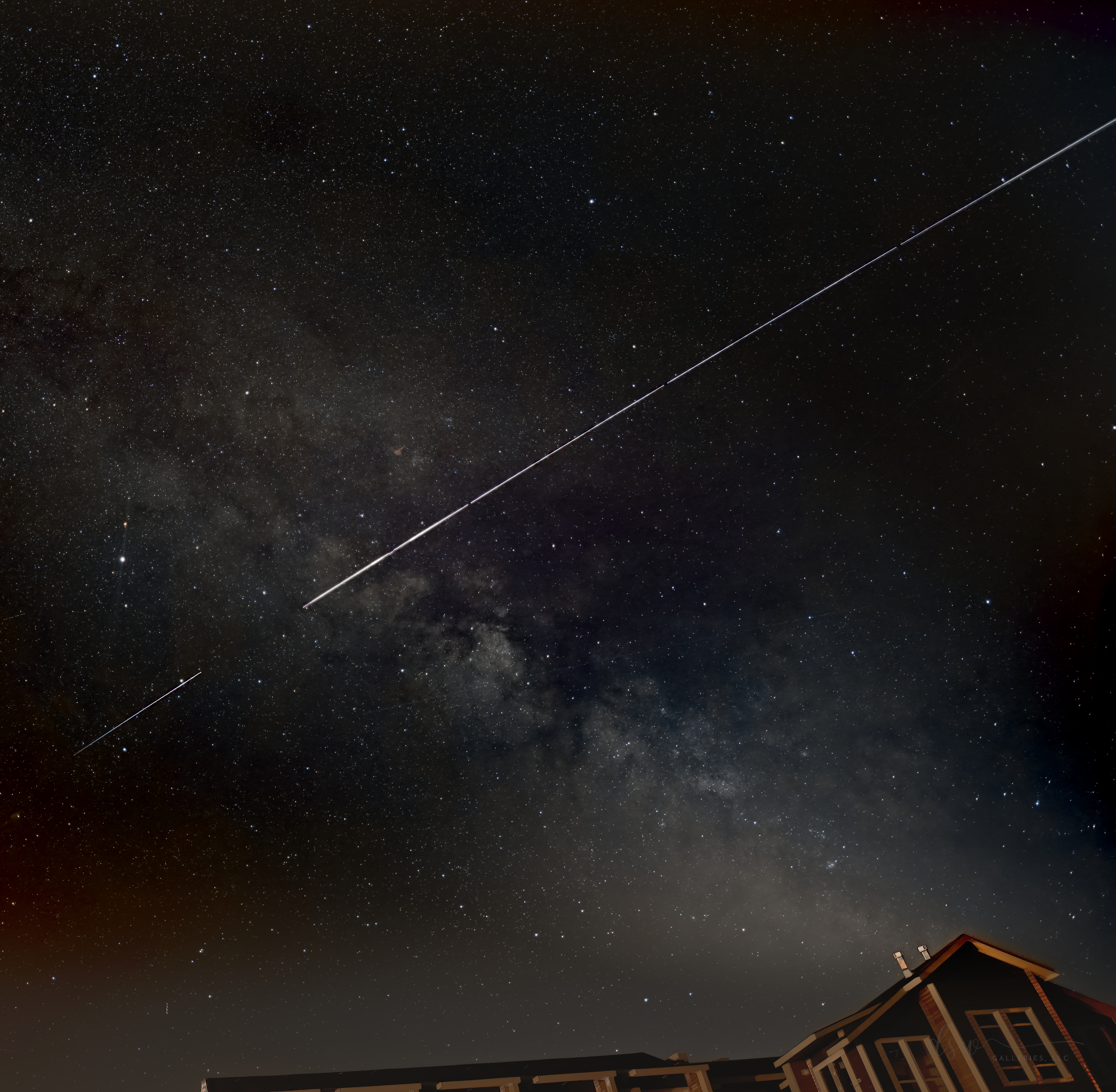 On a dark evening in Nye Beach, Newport, Oregon, the International Space Station (ISS) collides with the Milky Way over a local hotel across from the Pacific Ocean.