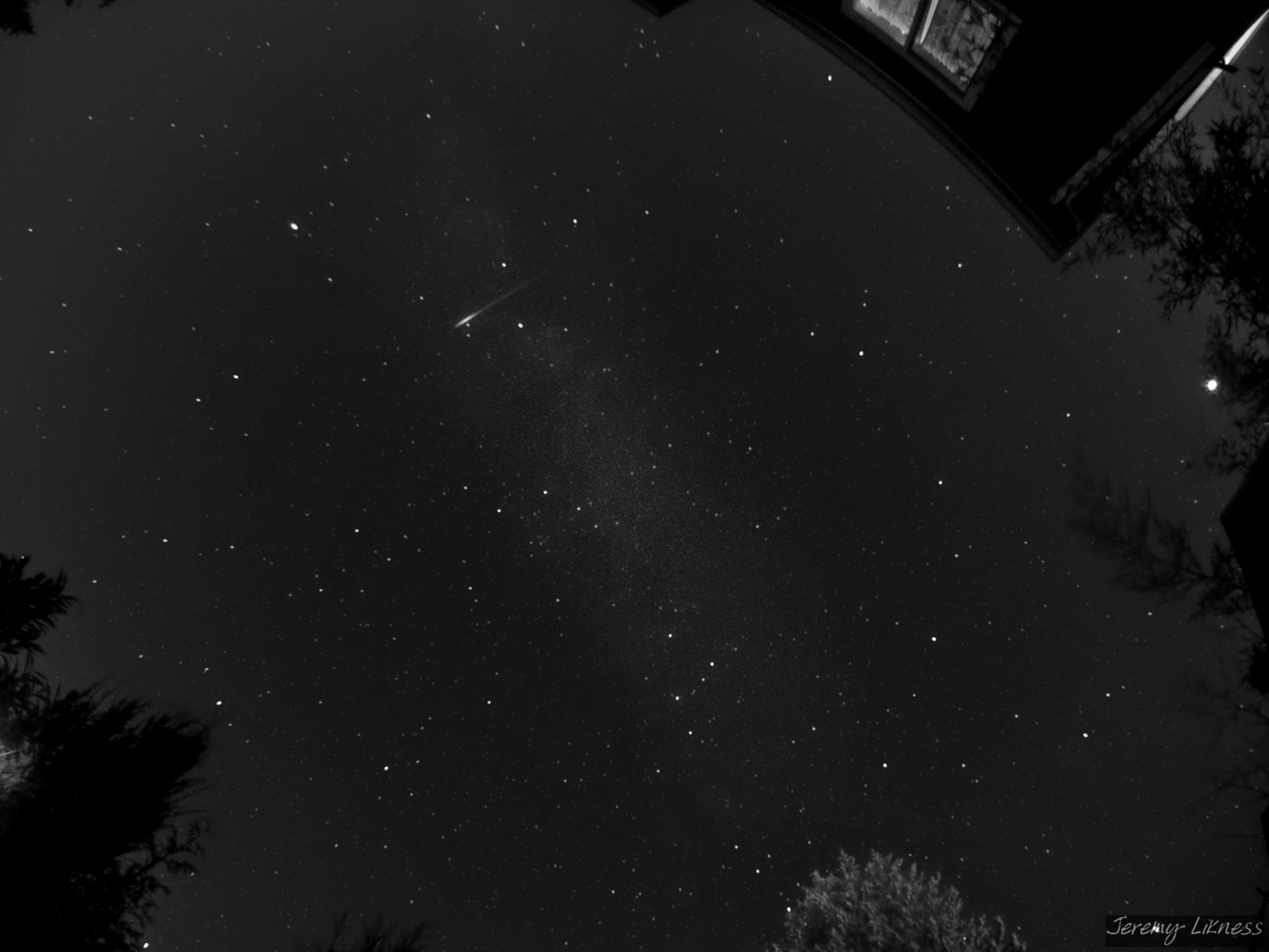 A meteor streaks in front of the Milky Way while Jupiter glows brightly on the edge.