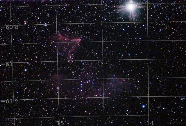 γ Cas or gamma Cas is the middle point of the 'W' that makes up the constellation Cassiopeia. It is a rapidly spinning variable star that is incredibly bright. It dominates the scene and overpowers the delicate, faint reflection nebula nearby designed IC59 and named, 'The Ghost of Cassiopeia.' It took me over 500 exposures to draw out the detail of this elusive nebula.