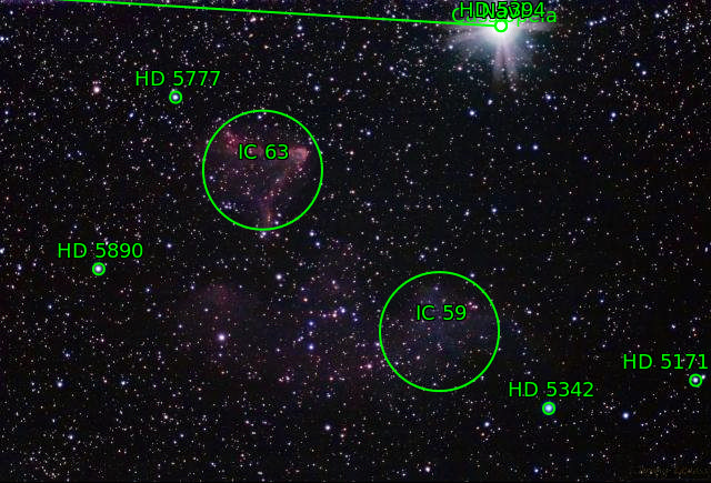 γ Cas or gamma Cas is the middle point of the 'W' that makes up the constellation Cassiopeia. It is a rapidly spinning variable star that is incredibly bright. It dominates the scene and overpowers the delicate, faint reflection nebula nearby designed IC59 and named, 'The Ghost of Cassiopeia.' It took me over 500 exposures to draw out the detail of this elusive nebula.