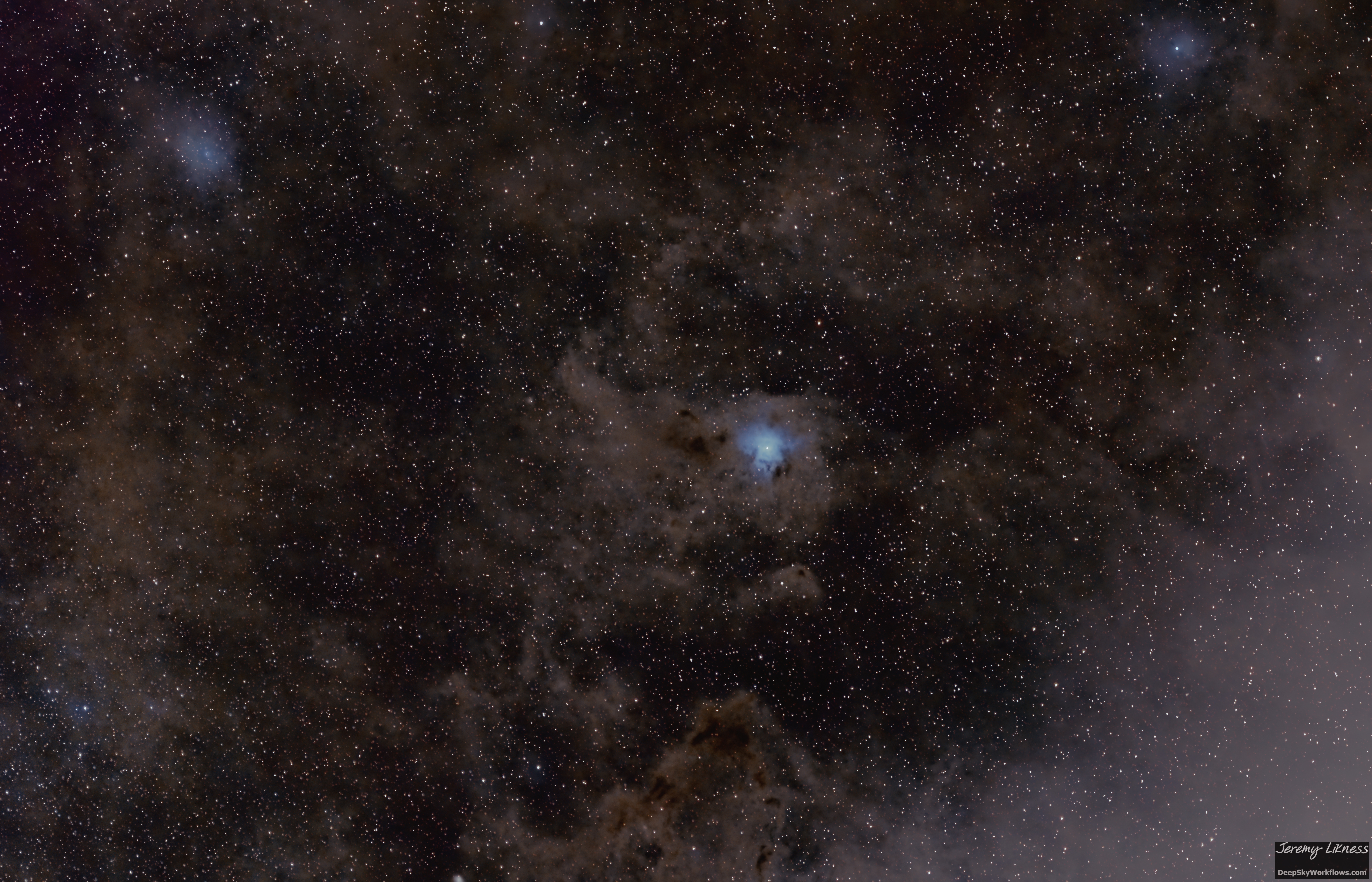 I'm learning how to process images with delicate and dusty features. I remembered how much dust I saw in an old photograph of the Iris Nebula, so I tried it out. This is the 3 hours of 60-second exposures with my Sony Alpha mirrorless (unmodified) camera and Samyang 12mm f/2 lens. And my best effort to process it all.