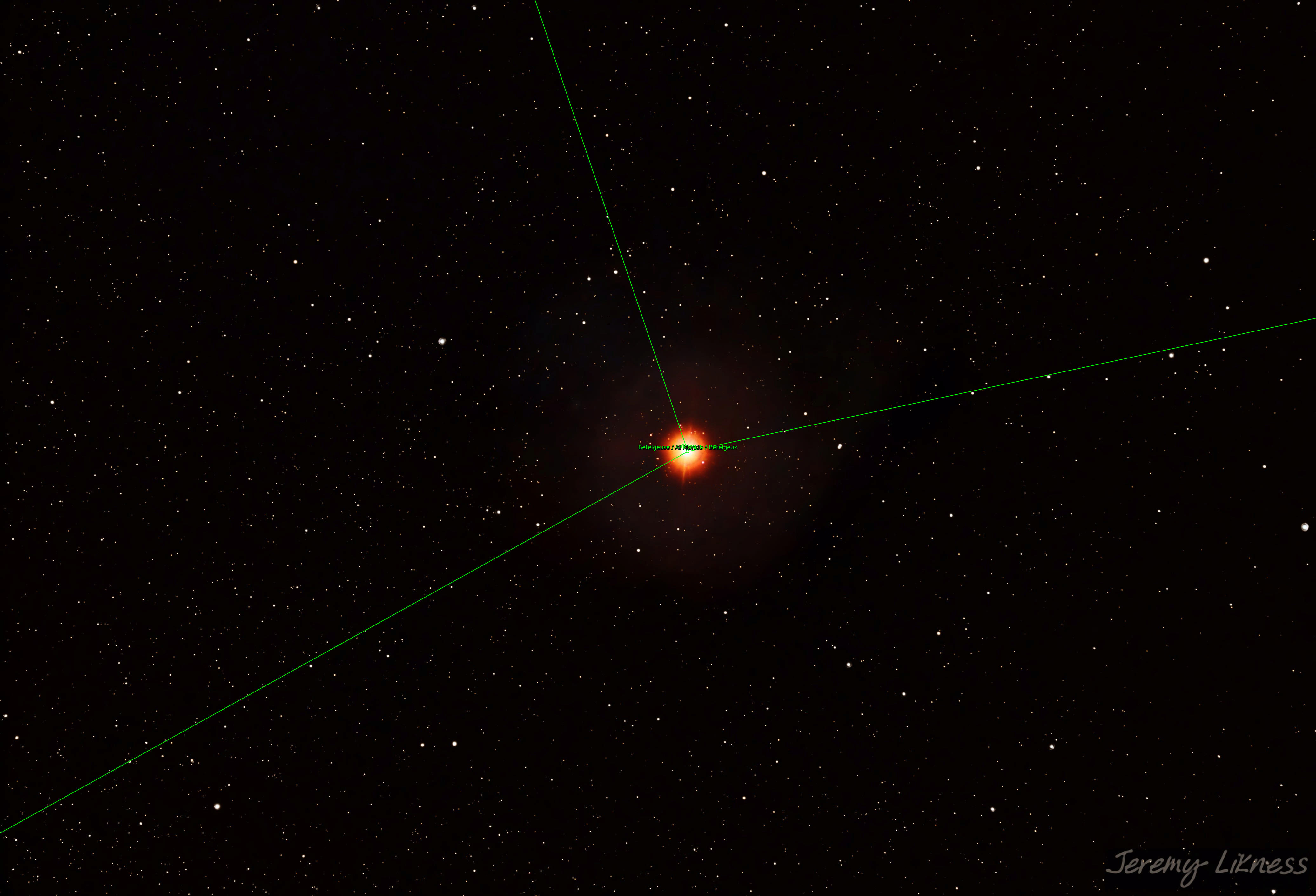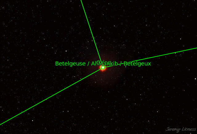This massive beacon in the night sky on Orion's 'shoulder' is a red supergiant with a mass 10 - 20 times that of our own sun. For comparison, if you exchanged the sun for Betelgeuse, the latter would swallow everything from Mercury through Mars to the asteroid belt. Most astronomers agree it is close to supernova +/- 100,000 years.