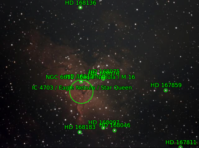 Located along the 'spine' of the Milky Way near several other popular nebulae, M16 has many names from the Star Queen to the Eagle Nebula. A vast emission nebula, at its heart lies the fabled Pillars of Creation. Just over 3 hours exposure went into this image.