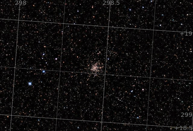 In the constellation Sagitta lies a controversial group of stars that might be a dense open star cluster, or may be an unusually loose globular cluster. Either way it's home to 20,000, many of which shine a distinctive gold color.