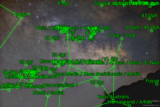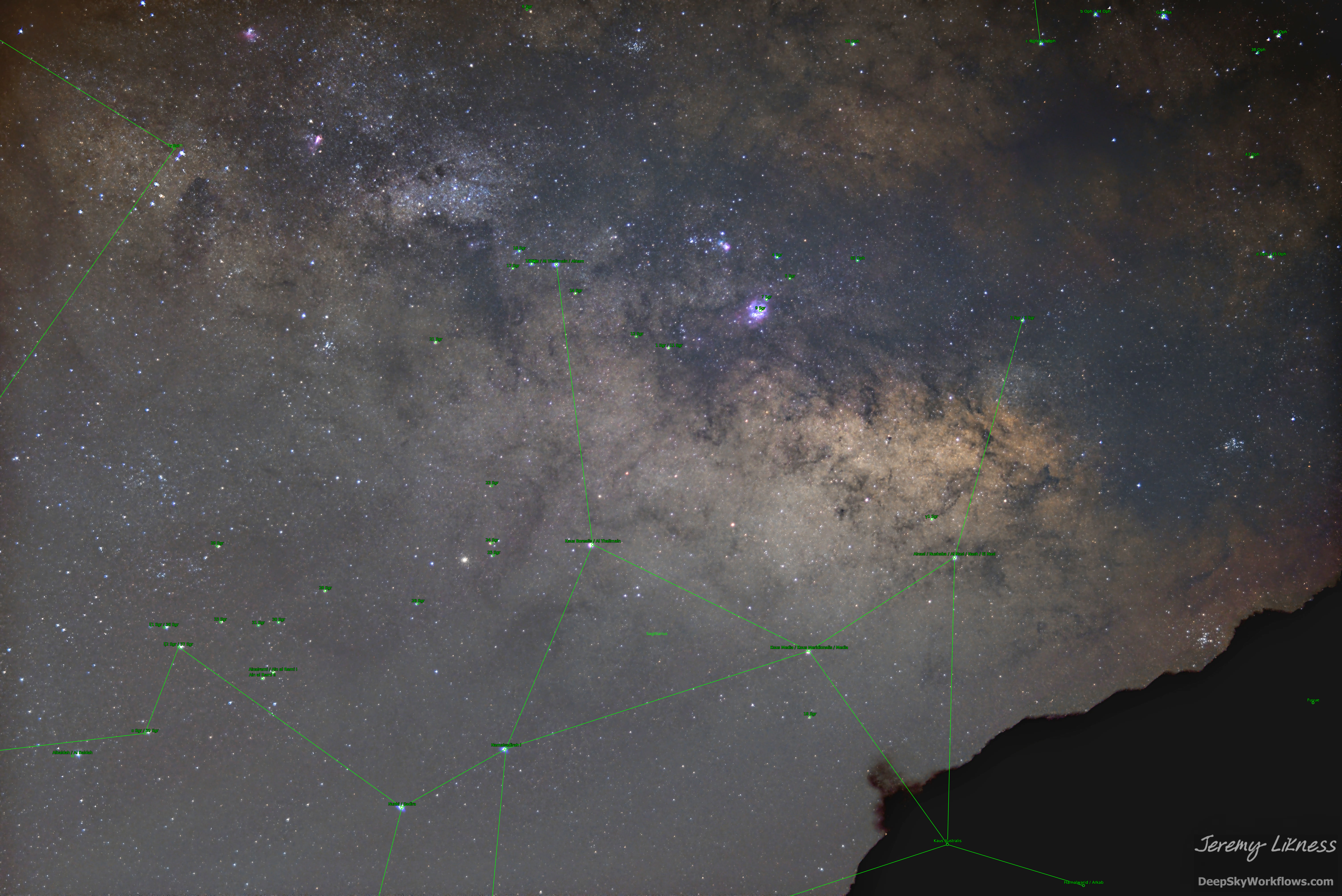 NGC6611 M16 Part of the constellation Sagittarius (Sgr) NGC6475 M7 NGC6514 M20 NGC6526 NGC6523 M8 IC4715 IC4701 Eagle Nebula Ptolemy's Cluster Small Sgr Star Cloud M24 Lagoon Nebula Trifid Nebula The star Kaus Australis (ε Sgr) 20 Sgr The star Nunki Sadira (σ Sgr) 34 Sgr The star Kaus Media Kaus Meridionalis Media (δ Sgr) 19 Sgr The star Kaus Borealis Al Thalimain (λ Sgr) 22 Sgr The star Alnasl Nushaba Al Nasl Nash El Nasl (γ Sgr) γ2 Sgr 10 Sgr The star Namalsadirah I (φ Sgr) 27 Sgr The star Hamalwarid Arkab (η Sgr) The star Fuyue (G Sco) The star Albaldah Al Baldah (π Sgr) 41 Sgr The star Garafsa (θ Oph) 42 Oph Heybrook Lookout