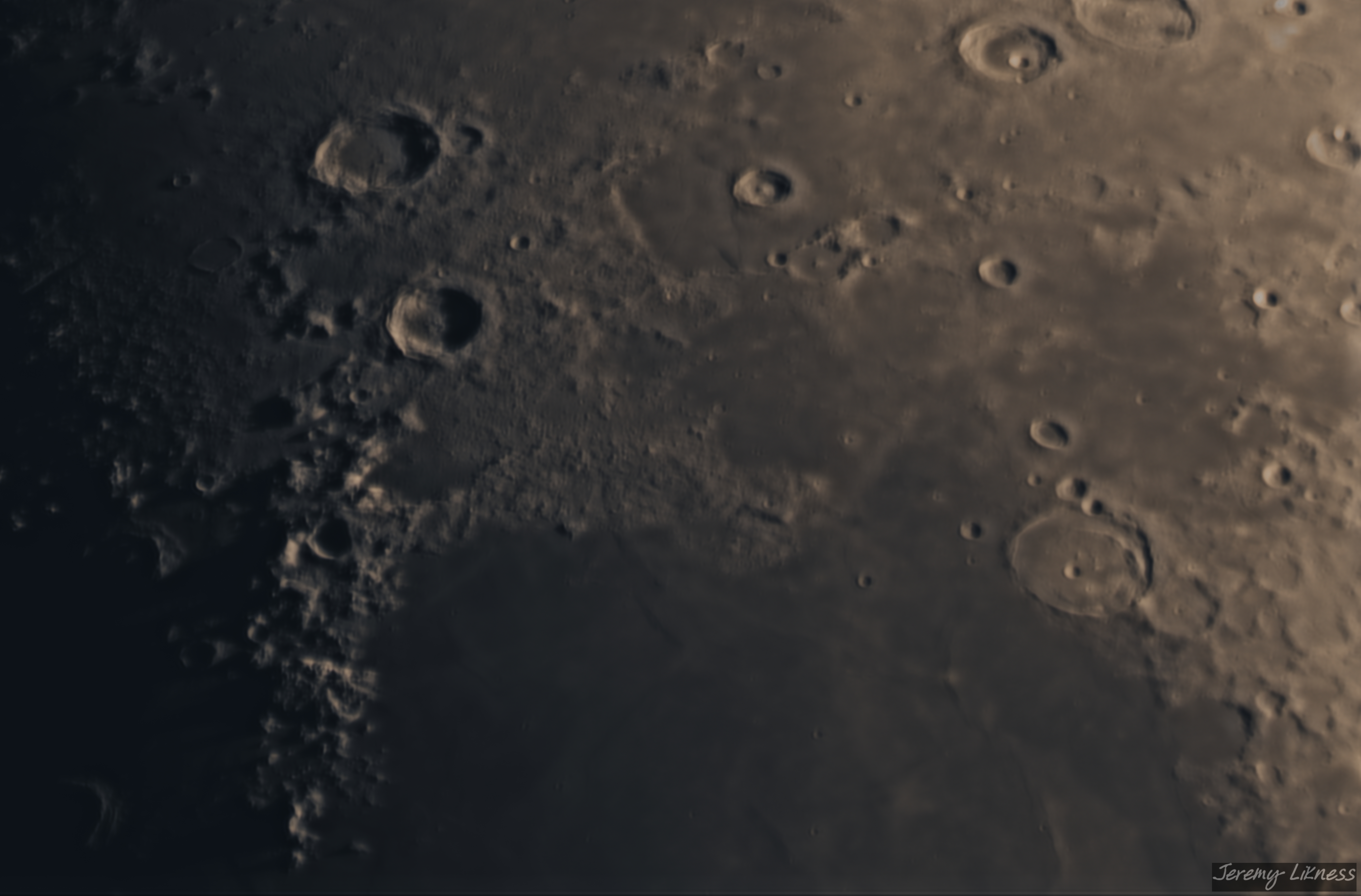 A close up of the Montes Caucasus ridge with craters Aristoteles and Eudoxus in the upper lest.