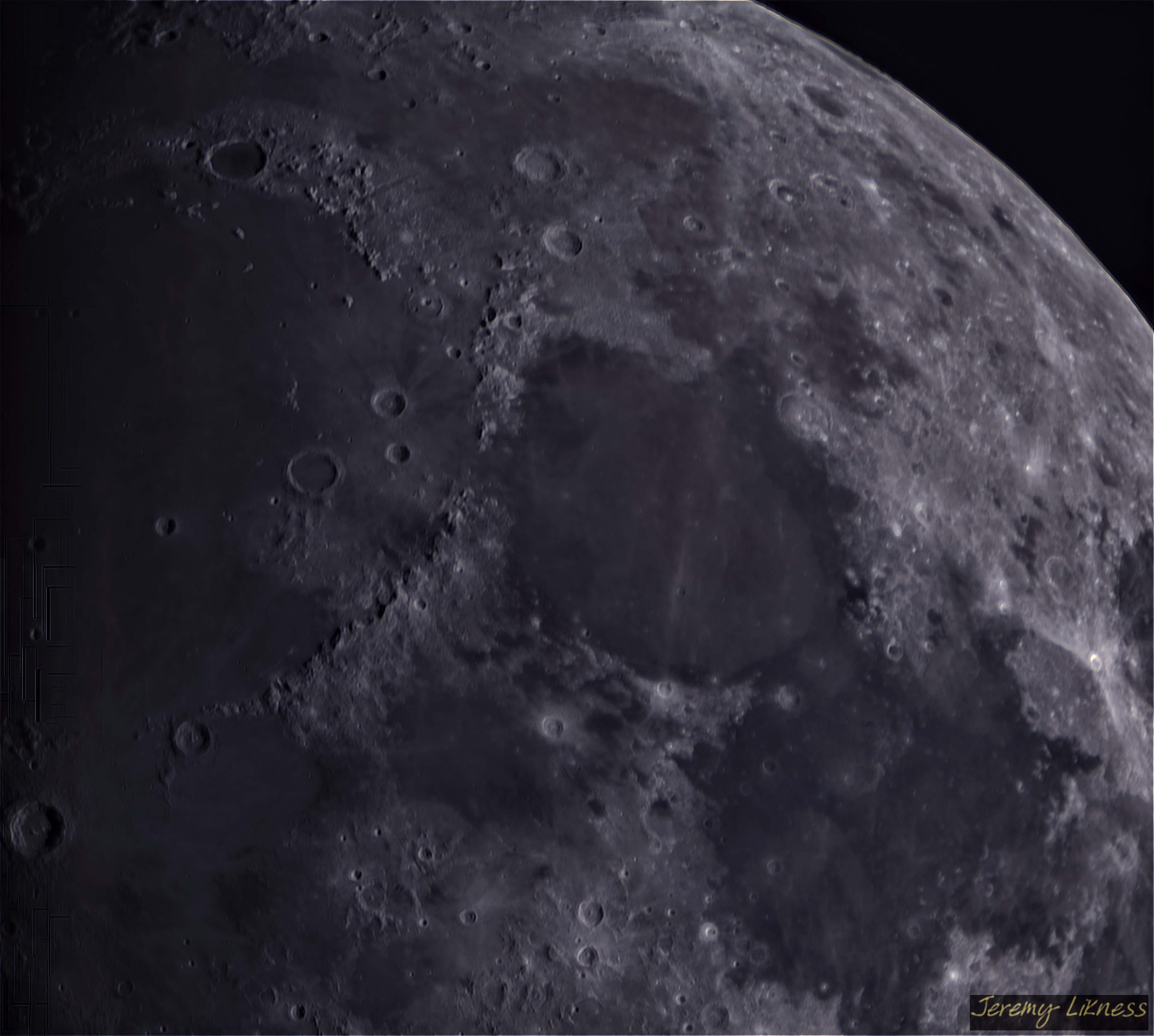 A close up of the 'northeast, upper left' portion of the August 2022 supermoon. You can clearly see ridges of long mountain ranges and prominent craters including Plato, Cassini, Eratosthenes, and more.