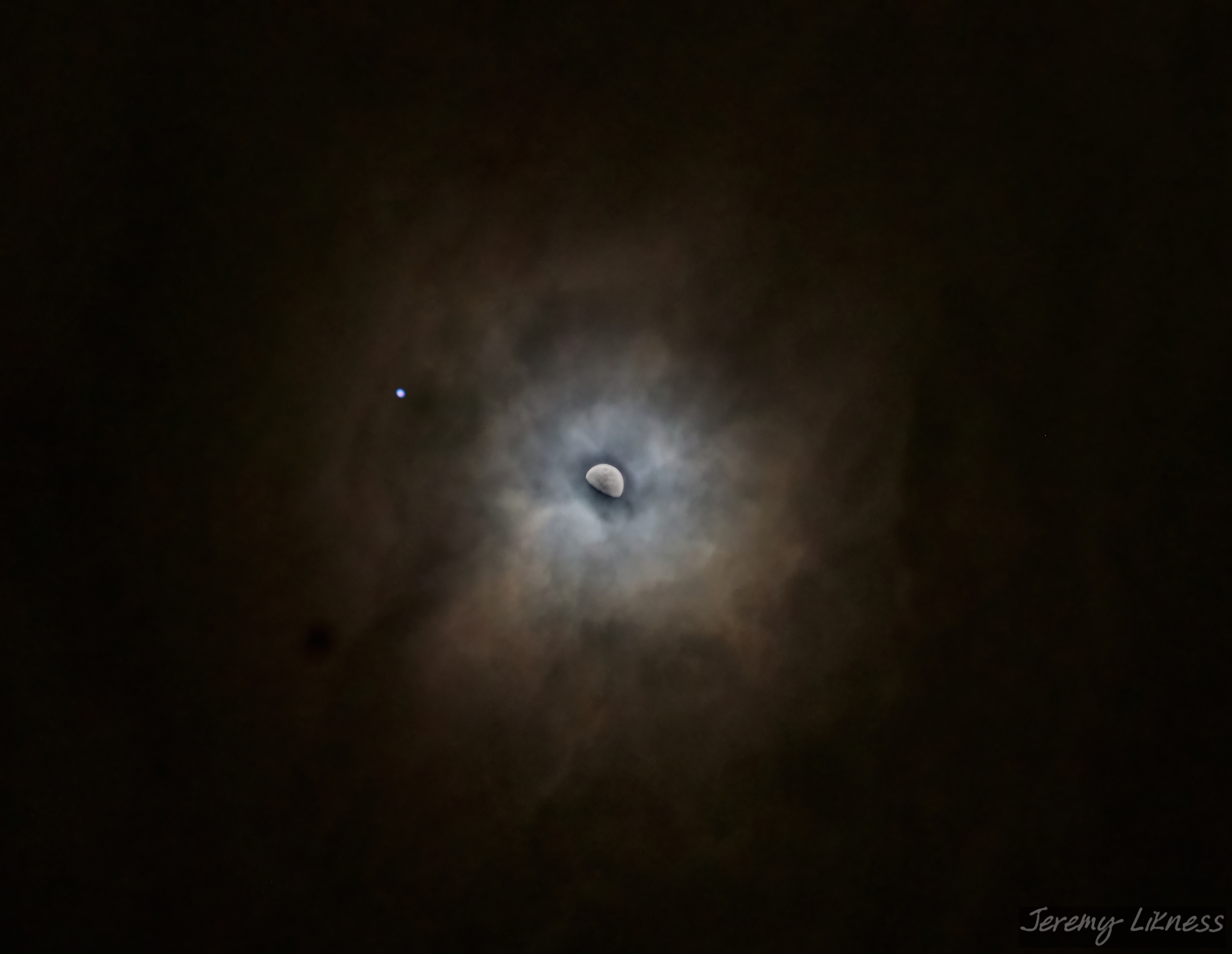 Despite their best effort, the clouds were unable to contain the defiant brilliance of the moon and nearby Jupiter.