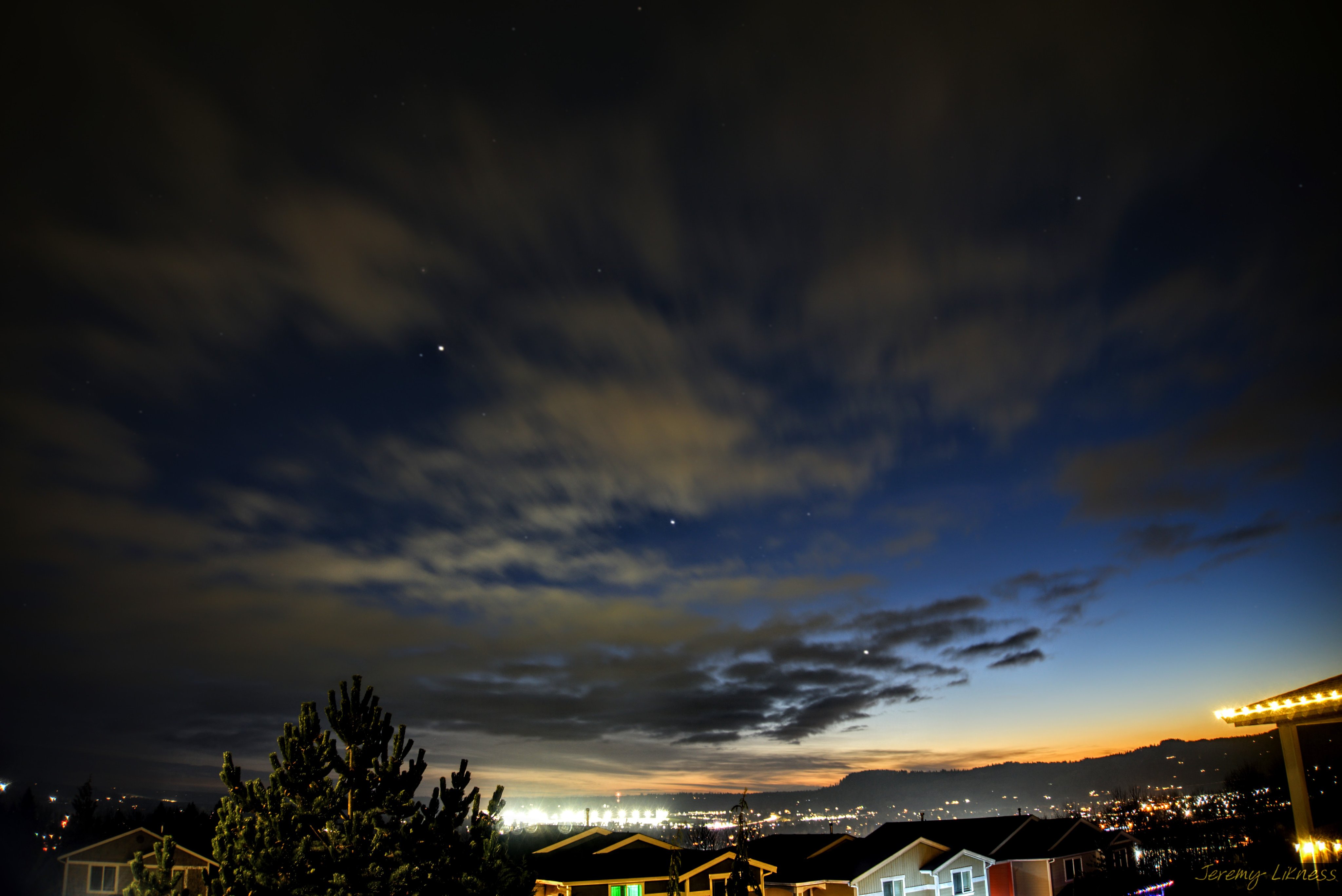 A conjunction of Jupiter, Saturn, and Venus at dusk.