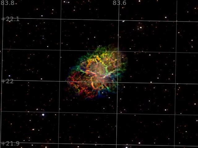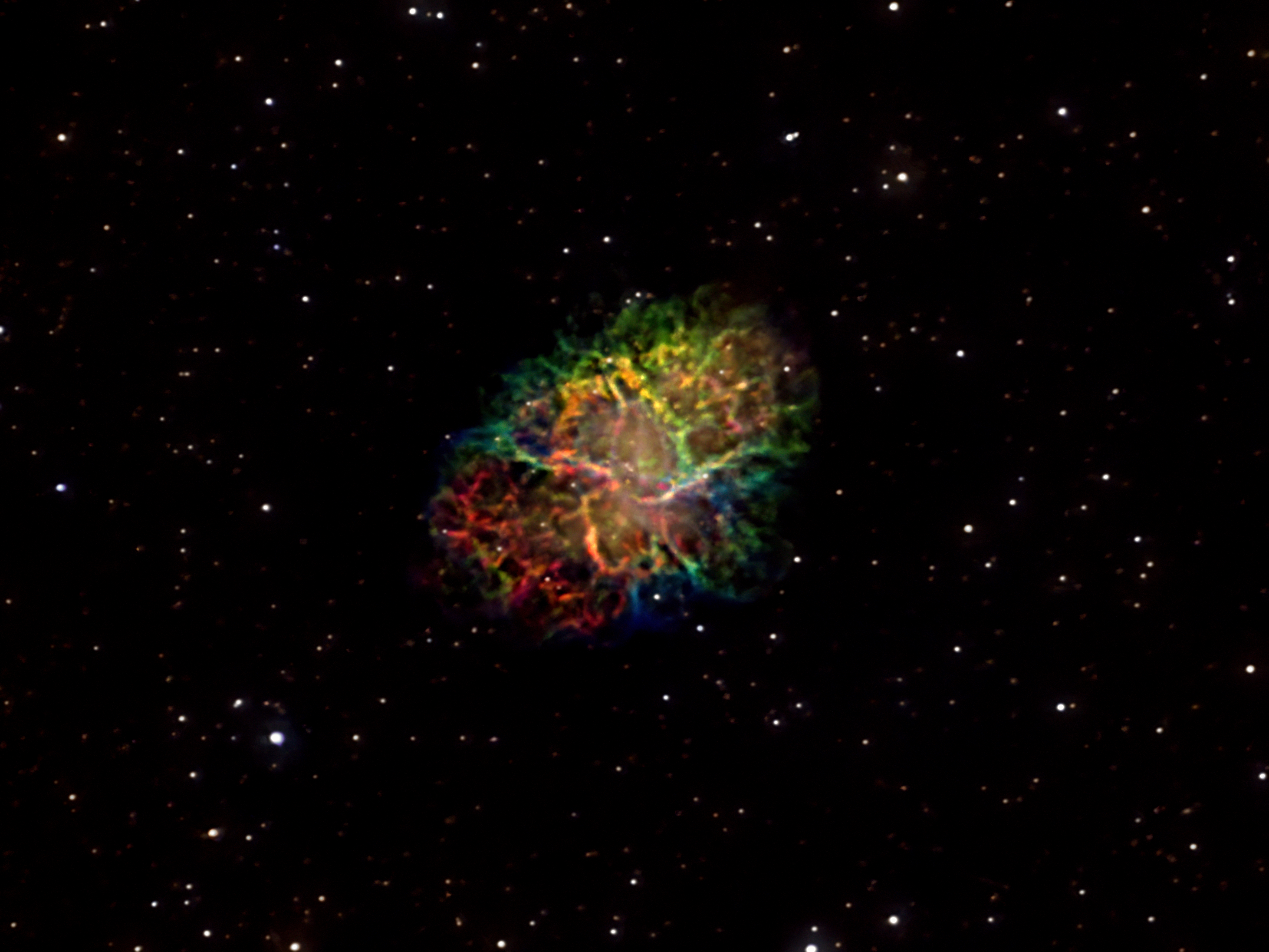 When Charles Messier was looking for Halley's Comet, he kept coming across a fuzzy patch he realized didn't move like a comet. So, he started a journal of these annoying distractions and designated the fuzzy patch 'M1.' Ages ago, a massive star spent the last of its fusion fuel and experienced a massive implosion that happened so fast, the inner part of the star sent shockwaves that ejected the outer portion. When the light eventually reached earth, it was so bright it could be seen by day for several years. References around the world have been found for a 'wandering star' that suddenly appeared and eventually faded. I trained my telescope on the spot and recorded photons for 12 hours. I took 3-minute exposures in the red, green, and blue spectrums and combined them for the first image. I also took 5-minute exposures of hydrogen alpha and oxygen III emissions and 7-minute exposures of sulfur II. These mapped to a SHO palette and blended with the visible light data. Everything was captured using a ZWO 294MM Pro in the 'unlocked' bin 1x1 mode at 8k by 4k resolution, then cropped to spotlight the nebula.