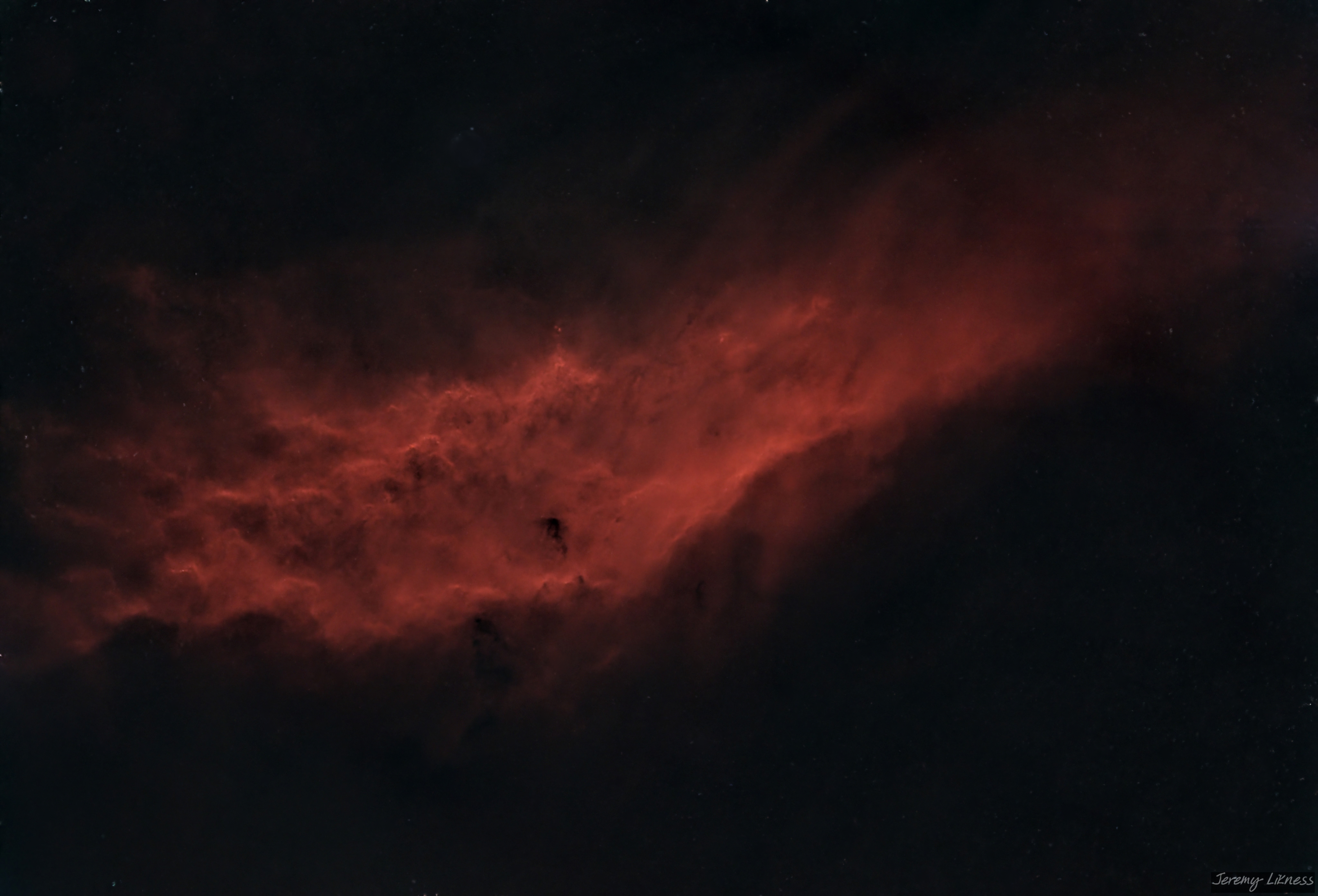 WLike a billowing blanket let down across the sky, this textured red streak is NGC1499, the California Nebula. It sprawls across 2.5 degrees of sky due east of M45.