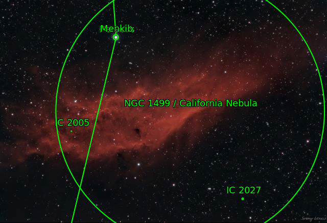 WLike a billowing blanket let down across the sky, this textured red streak is NGC1499, the California Nebula. It sprawls across 2.5 degrees of sky due east of M45.