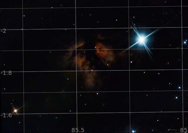The star ζ Orionis (Alnitak) is the leftmost star on the constellation Orion's belt. It is a triple star system hosted by a blue supergiant. Next to it bursts the Flame Nebula, an emission nebular supercharged by ultraviolet rays emanating from Alnitak. Often grouped with the more iconic Horsehead Nebula (IC434), the Flame stands well on its own.
