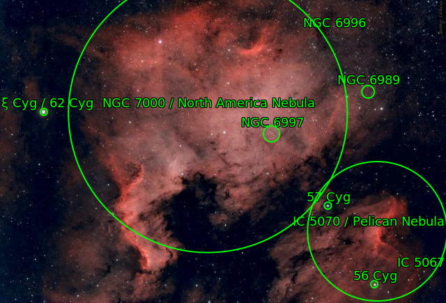 62 Cyg IC5070 NGC6989 NGC6997 NGC7000 North America Nebula Pelican Nebula The star 56 Cyg The star 57 Cyg The star ξ Cyg