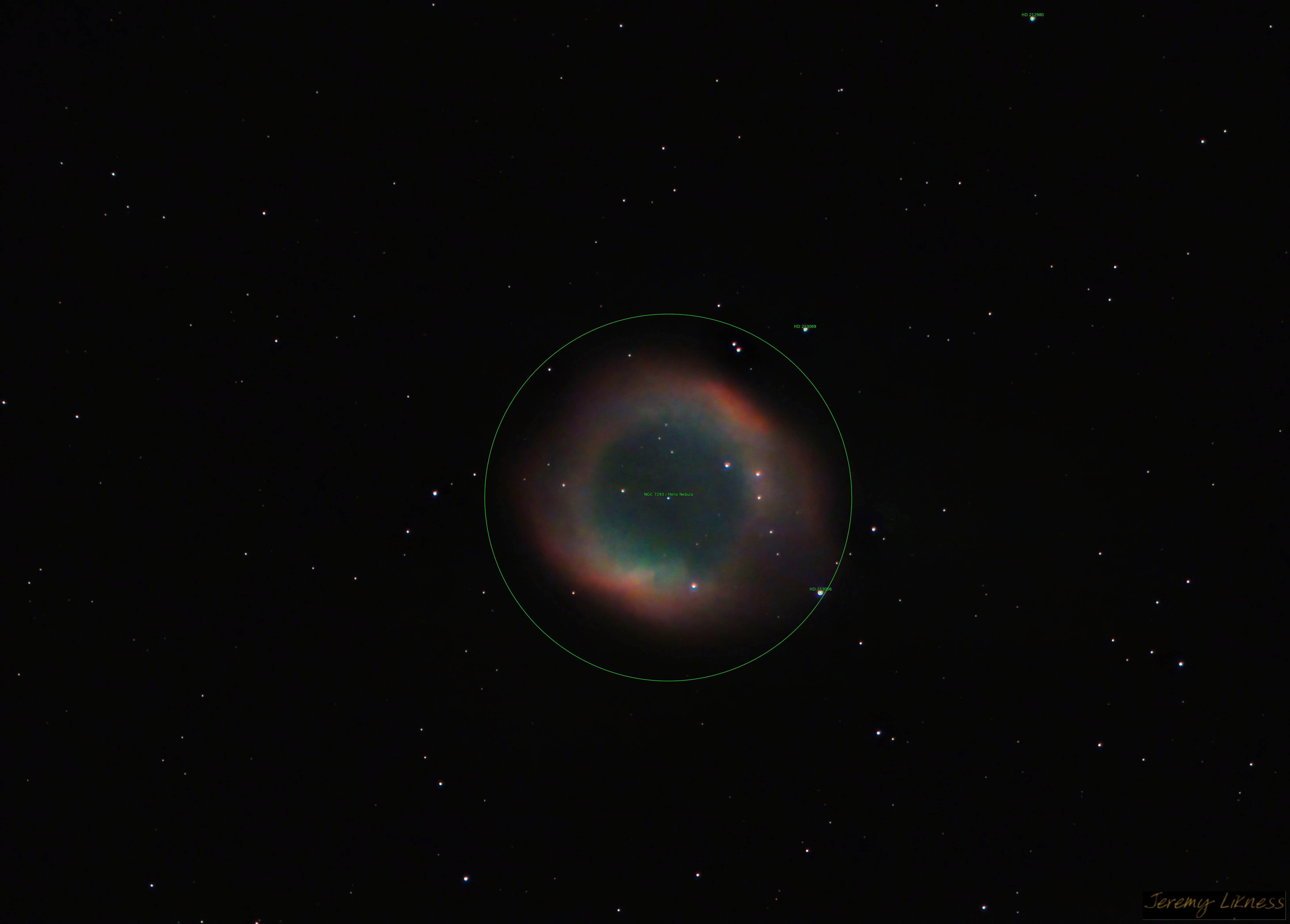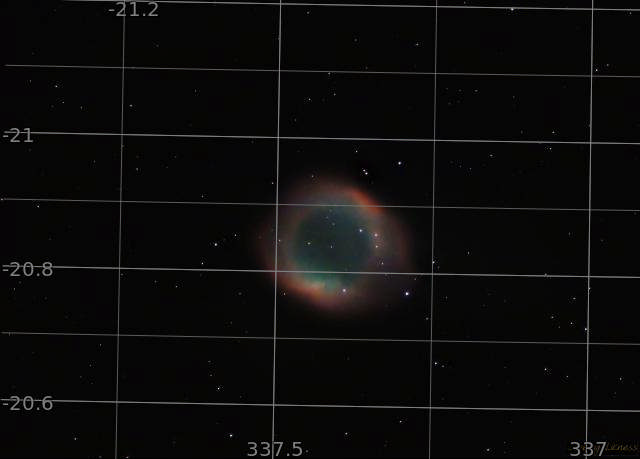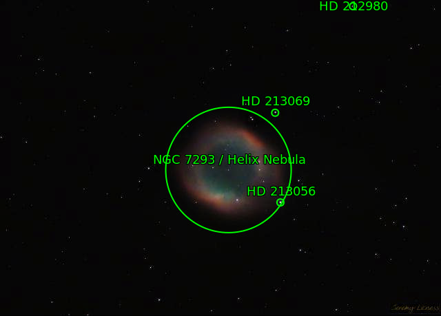 NGC7293 is the Helix Nebula, a planetary nebula about 600 - 700 light years from Earth. It's distinctive shape has given it the nicknames 'Eye of God' and 'Eye of Sauron.' From my location it never rises more than 30 degrees above the horizon so it was a tricky one to observe.
