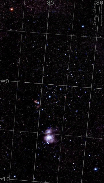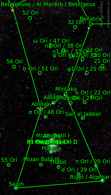 Part of the constellation Orion (Ori) The star Rigel Algebar (β Ori) 19 Ori The star Betelgeuse Al Mankib Betelgeux (α Ori) 58 Ori The star Bellatrix (γ Ori) 24 Ori The star Alnilam (ε Ori) 46 Ori The star Alnitak (ζ Ori) 50 Ori The star Saiph (κ Ori) 53 Ori The star Mintaka (δ Ori) 34 Ori The star Hatysa (ι Ori) 44 Ori The star Saif al Jabbar (η Ori) 28 Ori The star τ Ori 20 Ori IC434 Flame Nebula Orion B NGC1976 Great Orion Nebula Orion Nebula M42 NGC1982 Mairans Nebula M43 NGC2024 NGC2112