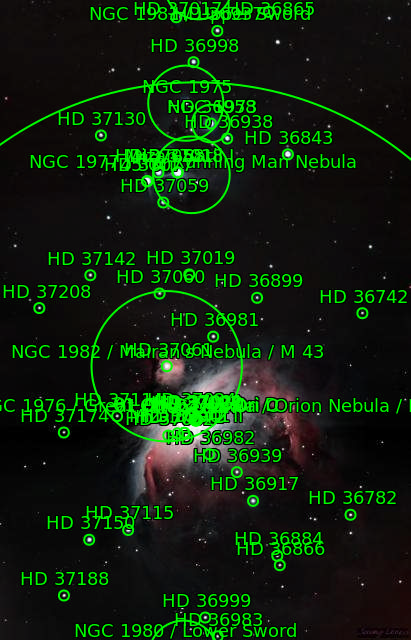 NGC1976 M42 The star θ1Ori The star θ2Ori NGC1982 M43 The star 42Ori NGC1973 NGC1975 NGC1977 The star 45Ori Great Orion Nebula Orion Nebula the Running Man Nebula Mairan's Nebula