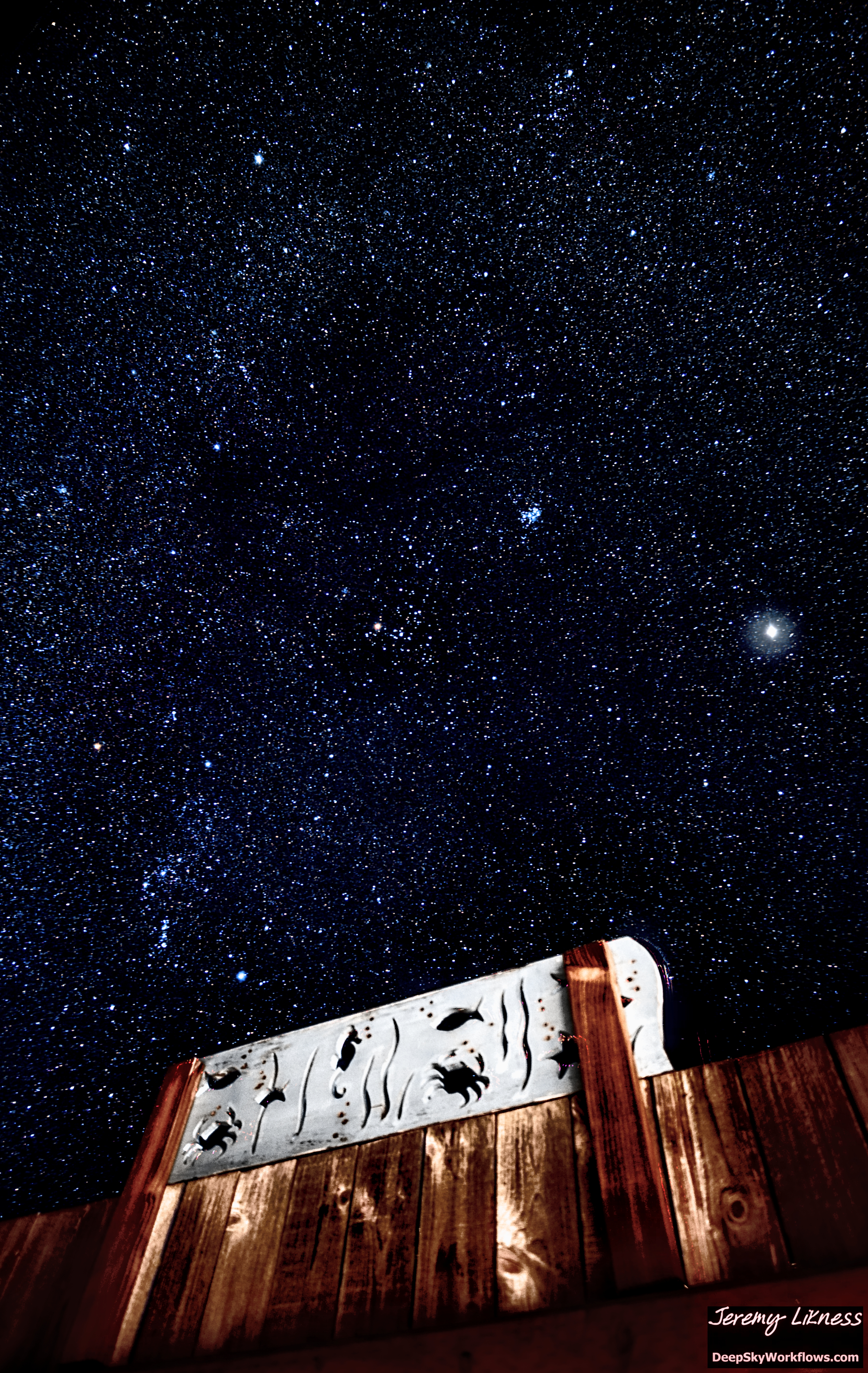 'Behind the fence.' A 45-second exposure taken last night for a timelapse. The bright object to the right is Jupiter. The bright cluster near the top middle is M45, the Pleiades, and the Orion constellation with brilliant Betelgeuse is in the lower left.