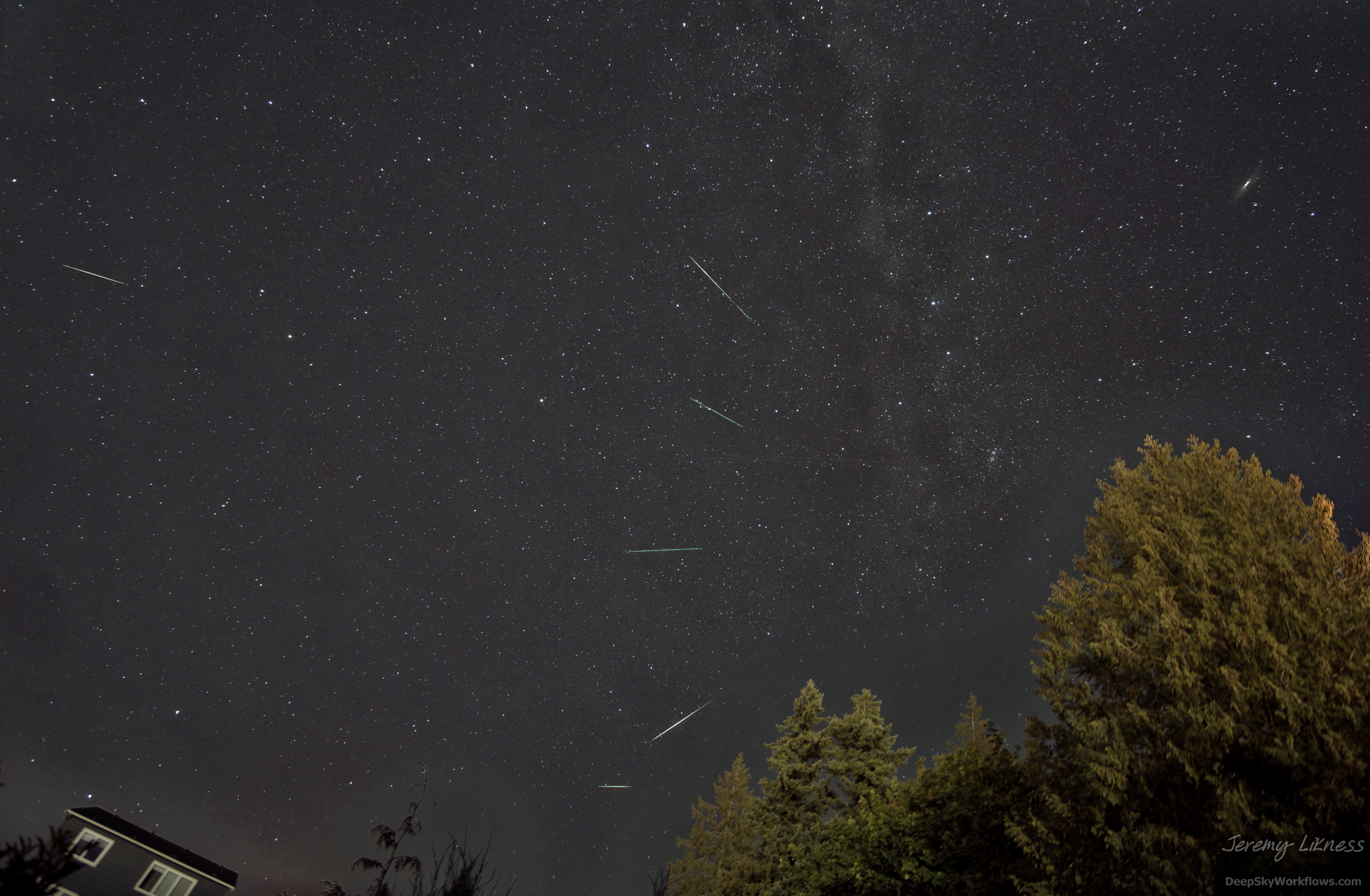 Last night's Perseids did not disappoint. The background is a 60-second exposure, then I star-aligned and overlaid the meteors from the other exposures. I usually identify meteors by their color, as satellite flashes are almost always white, and the Perseids are easy to spot because they all 'point' to a common origin near the Andromeda galaxy and the distinctive double cluster in Perseus.