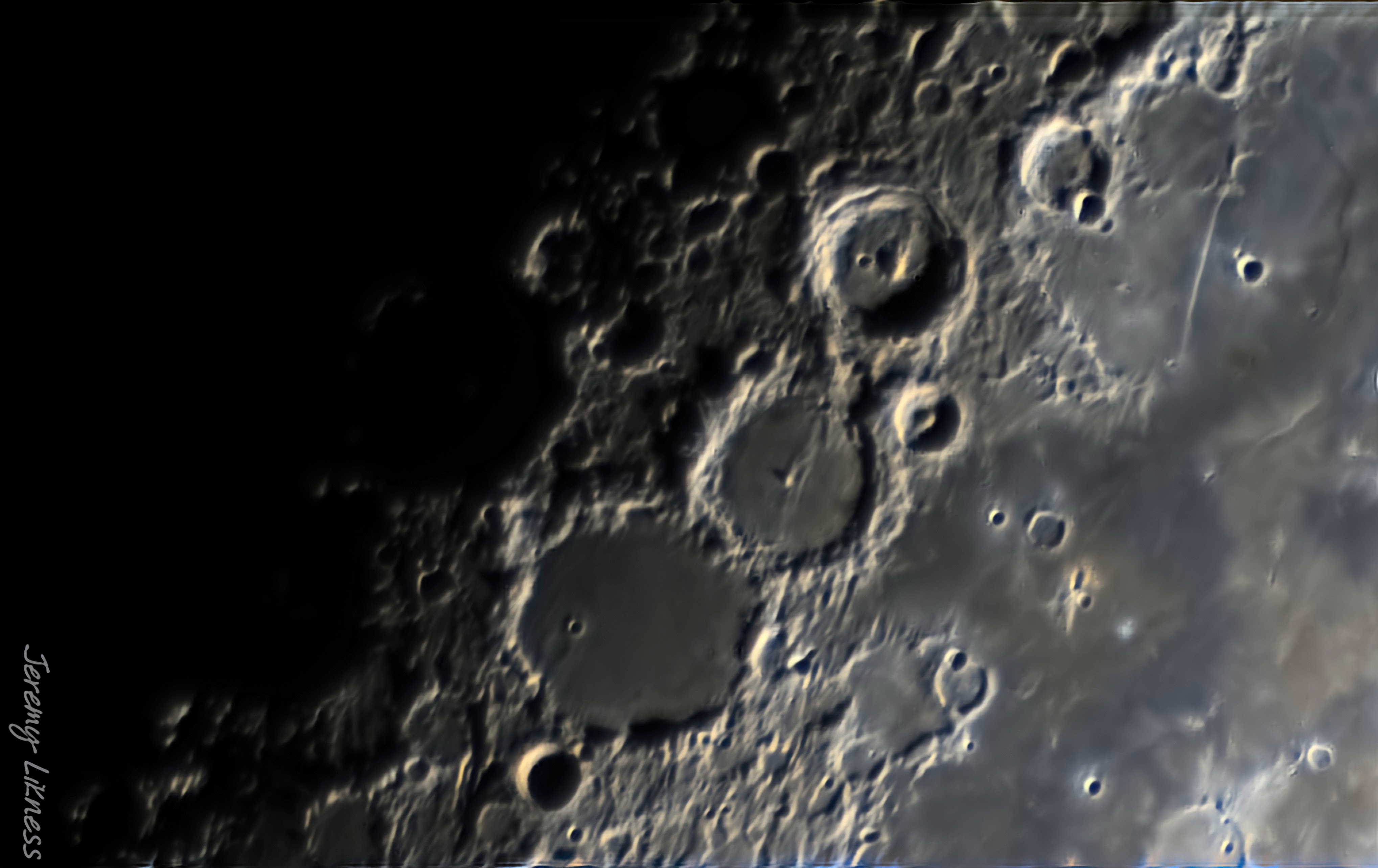 Closeup of the craters Ptolemaeus with Alphonsus, Arzachel, Albategnius and Herschel with long shadows at the edge of lunar daylight.