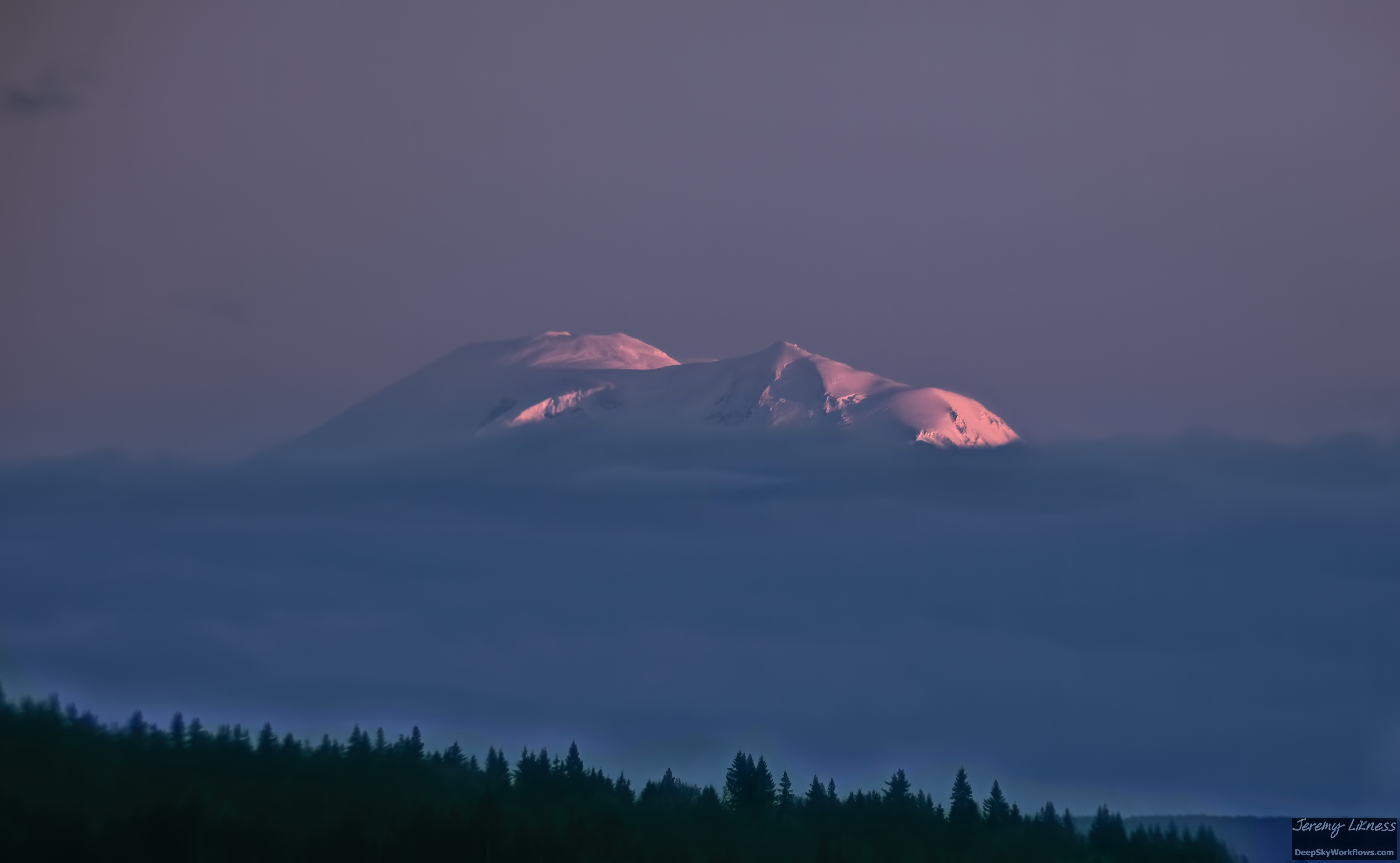 Caught the sunset reflecting from the snow-capped summit of Mt. Rainier as it emerged from a low cloud bank.