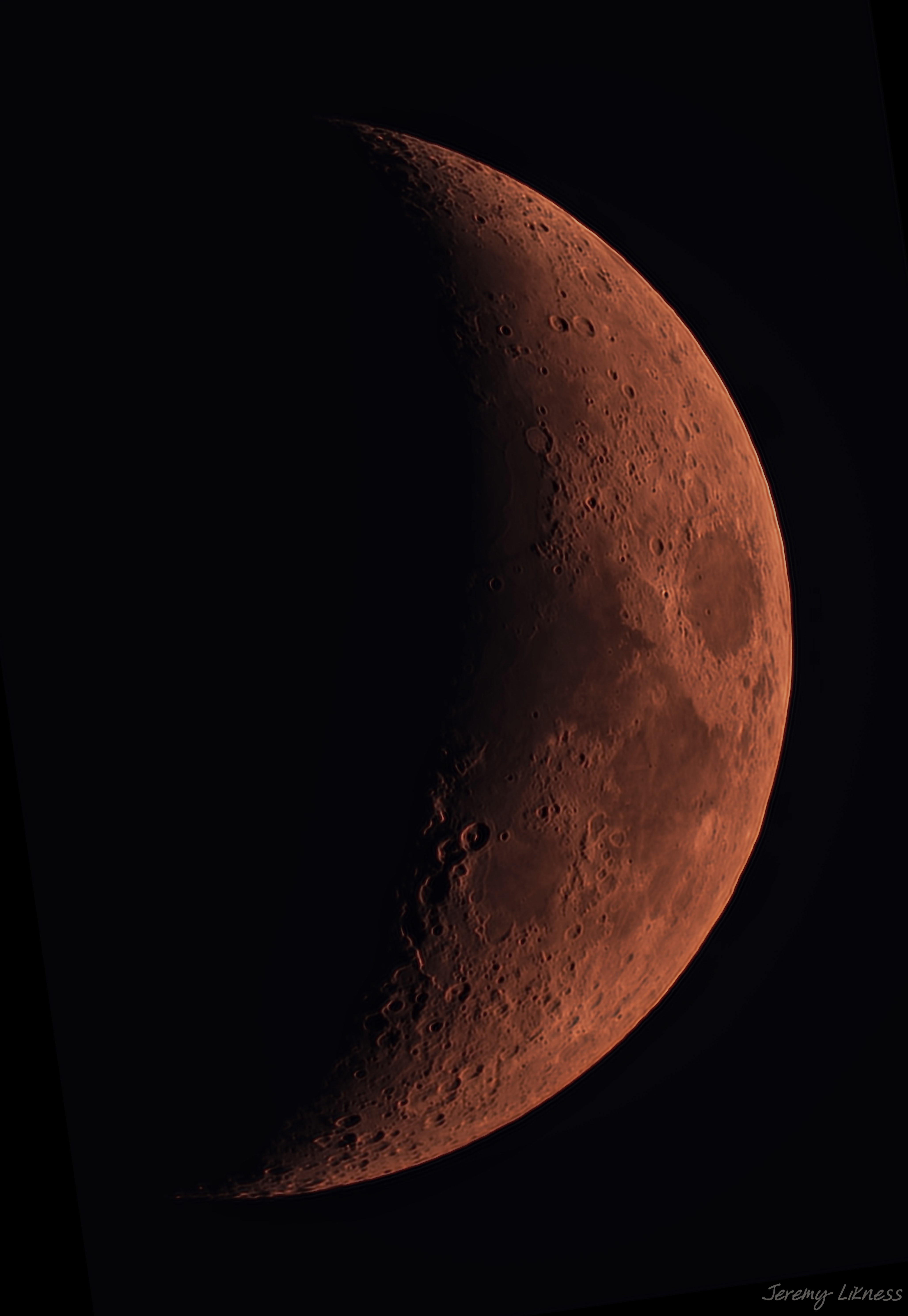 A detailed shot of a crescent moon turned red by smoke from forest fires.