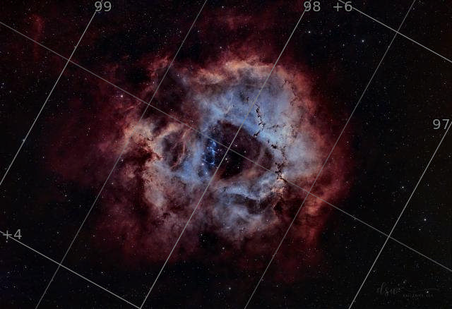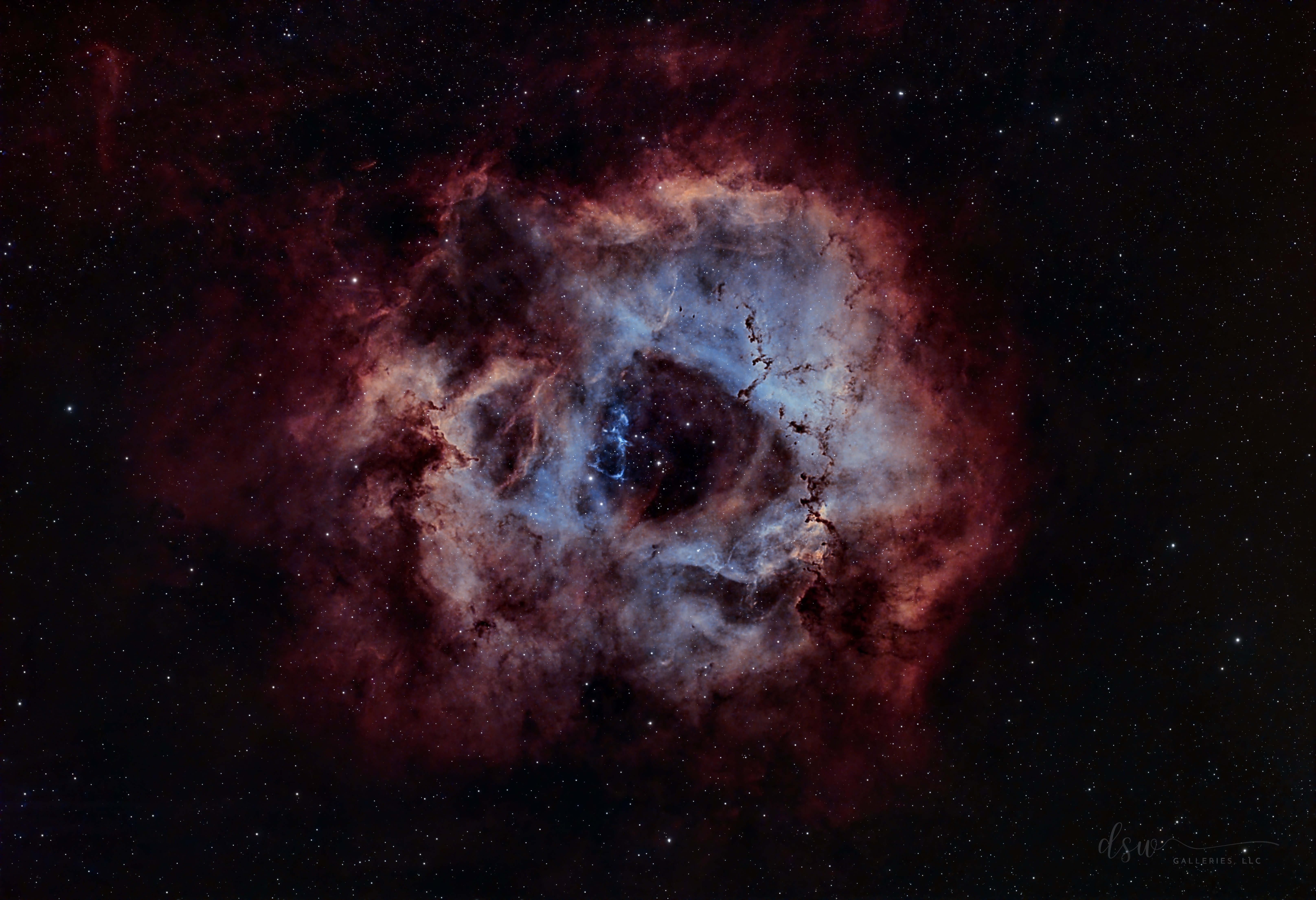 Caldwell 49 is the designation for the nebula commonly known as the Rosette Nebula. This is a massive nebula that hide a star-forming region only visible with X-rays. This is my highest fidelity image of the nebula to date. It contains over 10 hours of exposure data from sessions spanning over a year. It has the sharpest details of any nebula I photographed, great color balance and is absolutely stunning on a metal print. I chose an orientation that most closely resembles how it was framed in the sky. If you tilt your head so your chin is pointed at 7:30 and the top of your head to 1:30, you can see why this nebula is sometimes referred to as the Skull Nebula.