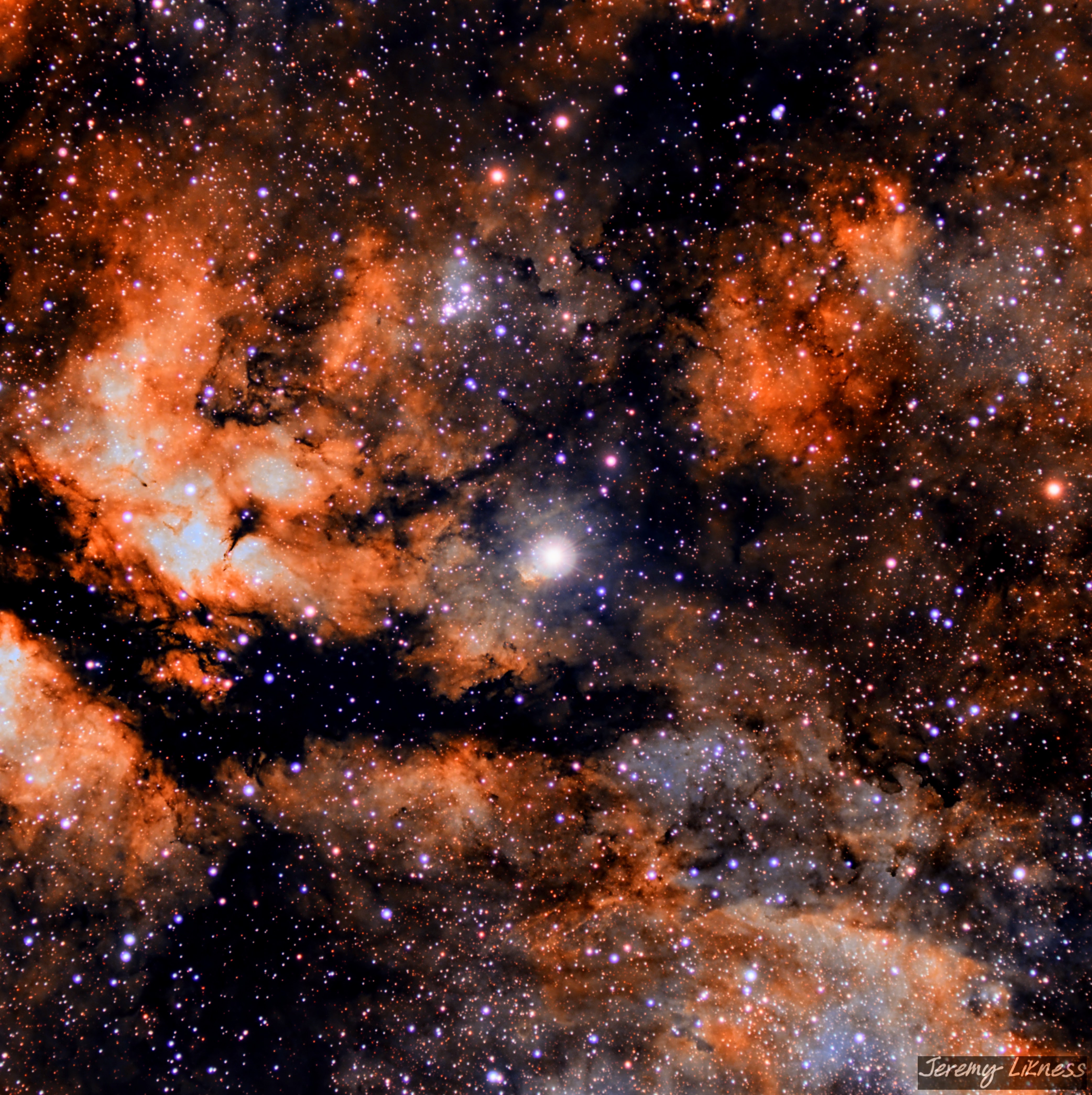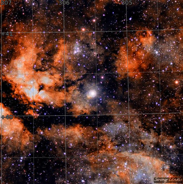 The Sadr region is the name of the nebulosity that surrounds the brilliant center star of Cygnus' cross. Here, the massive supergiant estimated to contain over 10 times the mass the sun in a radius 150 times as wide glows triumphantly in the center of the frame. I used a new technique to bring out new detail from an old capture.