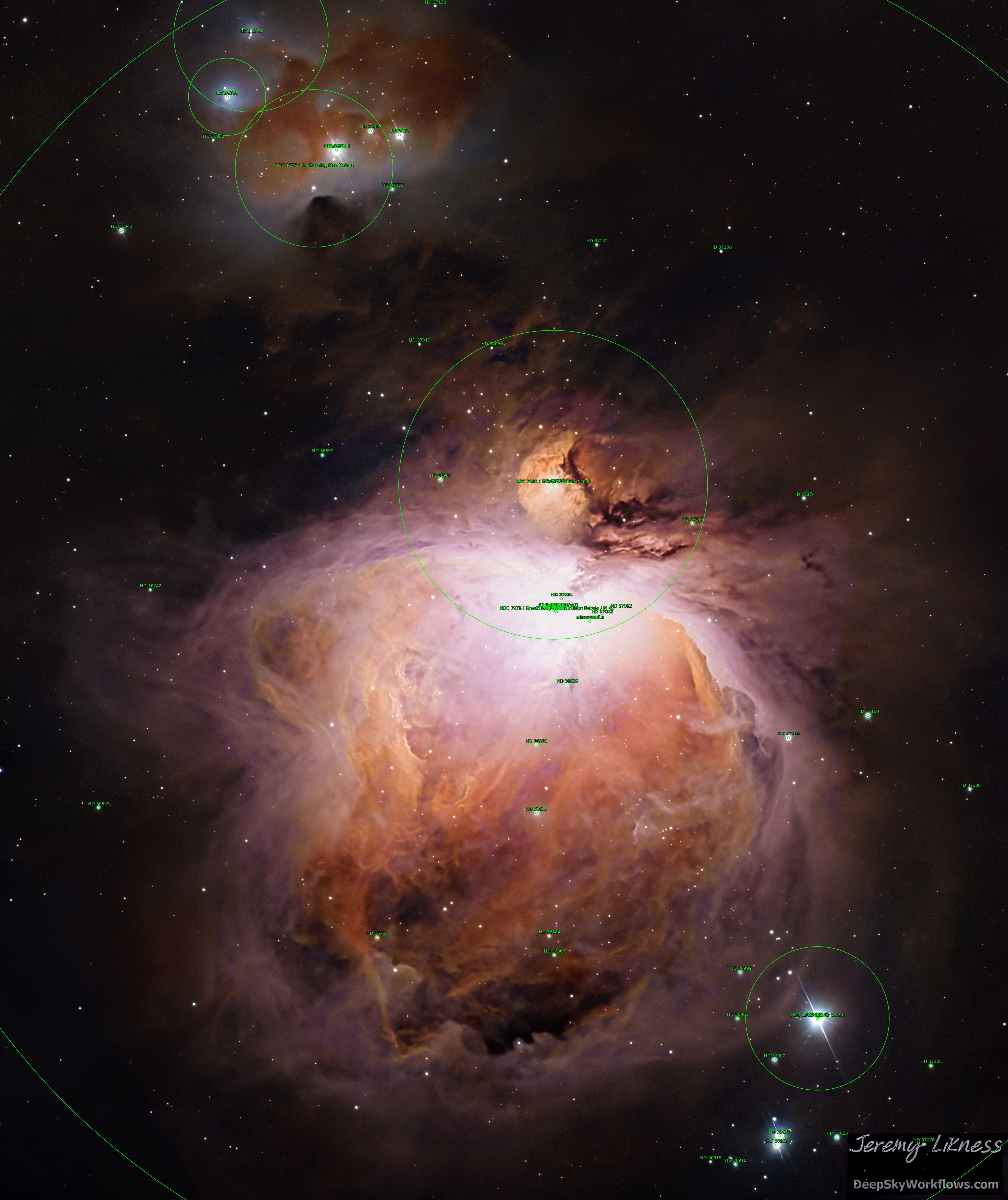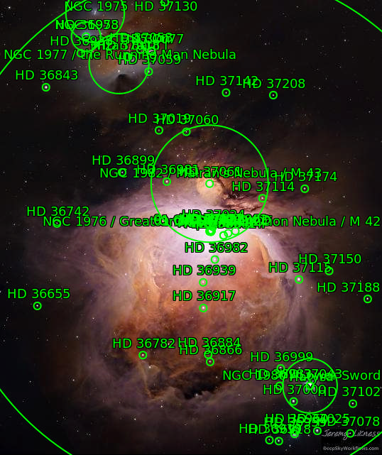 The star Hatysa (ι Ori) 44 Ori The star Mizan Batil I (c Ori) 42 Ori The star Trapezium (θ1 Ori A) 41 Ori A The star Mizan Batil II (θ2 Ori) 43 Ori The star θ1 Ori C 41 Ori C The star θ1 Ori D 41 Ori D The star 45 Ori NGC1973 NGC1975 NGC1976 Great Orion Nebula Orion Nebula M42 NGC1977 the Running Man Nebula NGC1980 Lower Sword NGC1982 Mairans Nebula M43