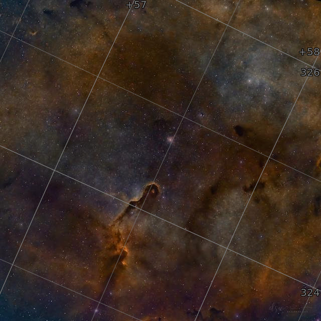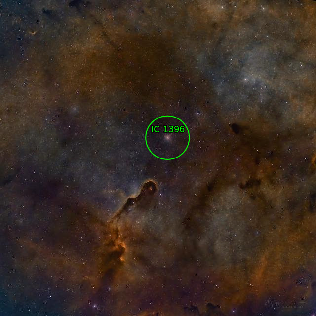 IC1396 refers to a massive region of interstellar gas and dust that is ionized by the continuous radiation blasting from the massive star designated HD 206267. It is more commonly known for the concentrated pillar that is starkly illuminated by the star and forms a distinct loop that looks like an elephant's trunk. Hence, IC1396A is also known as 'the Elephant's Trunk Nebula.'