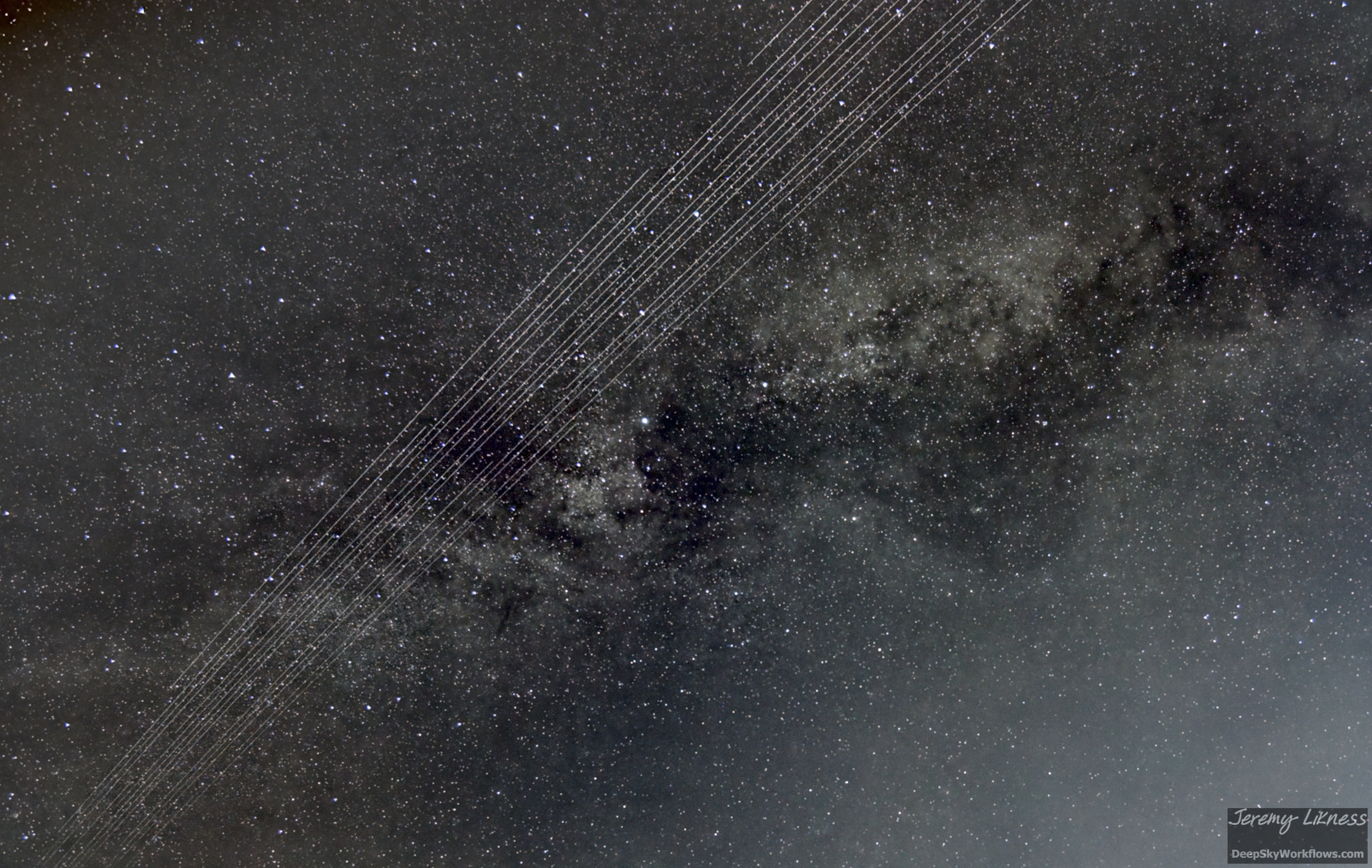A Starlink satellite train is an eerie thing to witness. It looks like a string of pearls or white dots moving in a straight line that terminates in earth's shadow. This is the first time I caught one on camera. This is 5 45-second exposures stacked together.