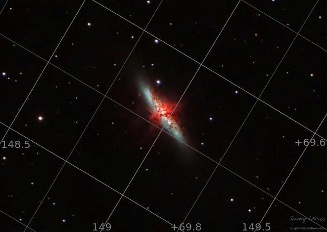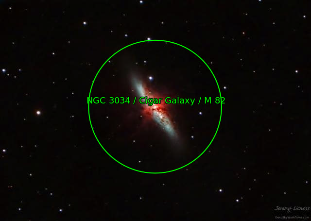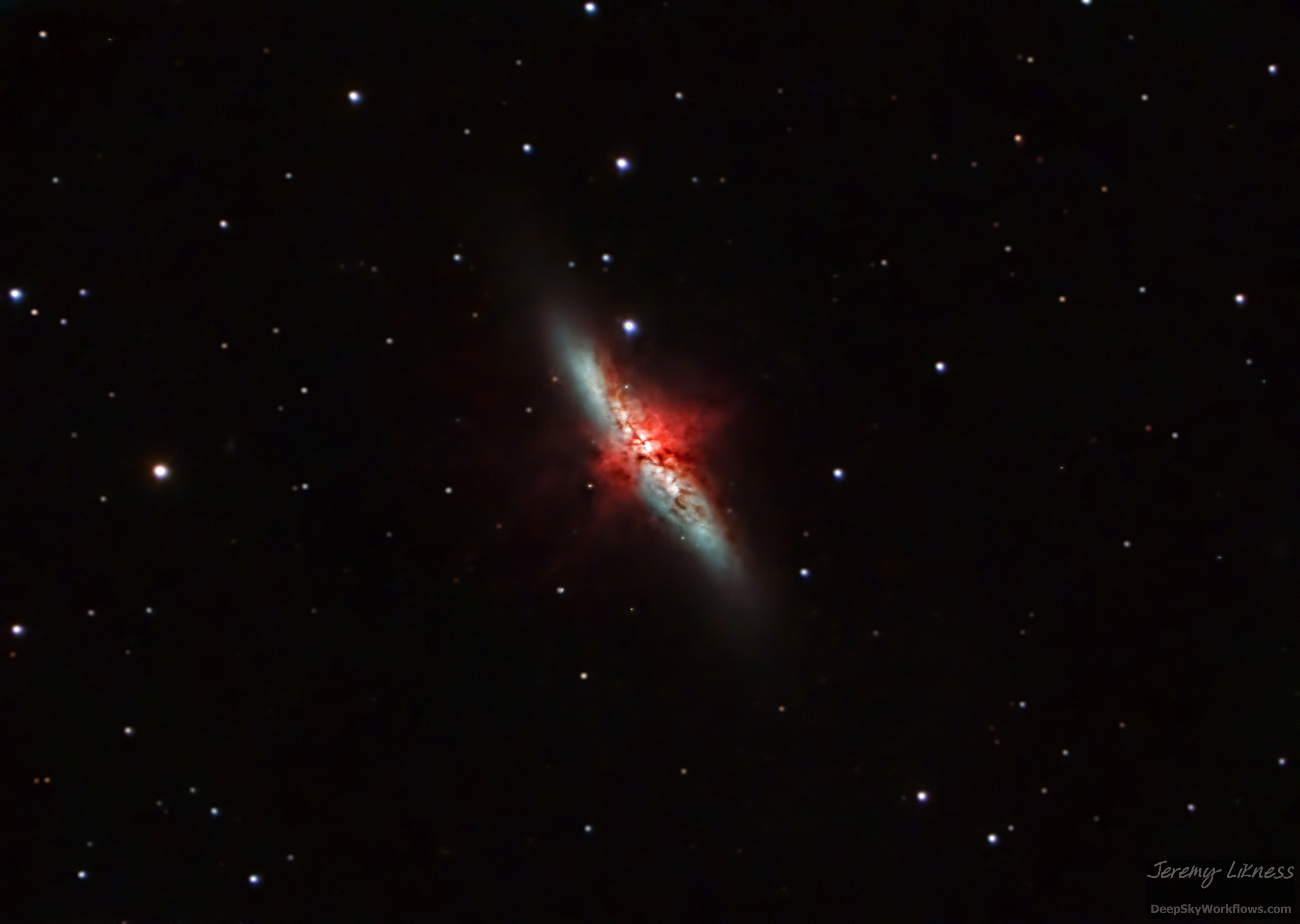 Starburst galaxies are believed to experience incredibly rapid star growth compared to other galaxies. M82, the Cigar Galaxy, is both visually and physically located near M81, Bode's Galaxy. Tidal interactions between the two funneled gas into the core of M82 that led to a massive period of rapid star growth. Despite the bright strawberry moon, I was able to capture this image of M82 in the opposite edge of the sky last night from my backyard in Monroe, WA.