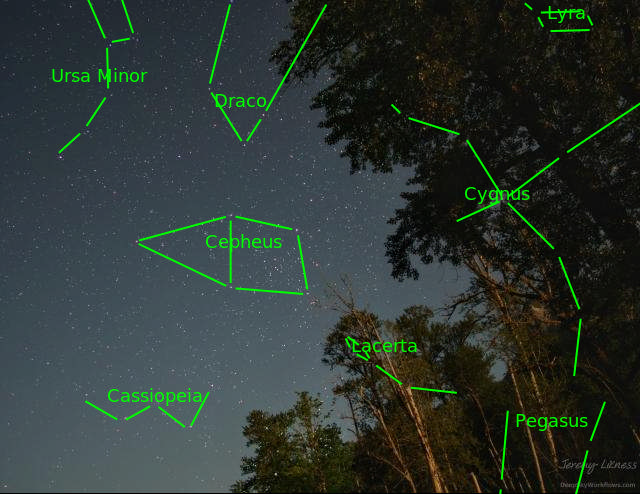 NGC7000 The constellation Cassiopeia (Cas) Part of the constellation Draco (Dra) Part of the constellation Cygnus (Cyg) Part of the constellation Lyra (Lyr) NGC6960 Part of the constellation Pegasus (Peg) Part of the constellation Ursa Minor (UMi) The constellation Lacerta (Lac) The constellation Cepheus (Cep) IC1831 North America Nebula Veil Nebula The star Fawaris Fawaris II (δ Cyg) 18 Cyg The star Caph (β Cas) 11 Cas The star Deneb Arided Aridif Arrioph (α Cyg) 50 Cyg The star Polaris Alrucaba Cinosura Tramontana Yilduz Mismar (α UMi) 1 UMi The star Alderamin (α Cep) 5 Cep The star Navi (γ Cas) 27 Cas The star Shedar Shedir (α Cas) 18 Cas The star Ruchbah Ksora (δ Cas) 37 Cas The star Sadr (γ Cyg) 37 Cyg The star Aljanah Gienah Cygni Al Janah (ε Cyg) 53 Cyg