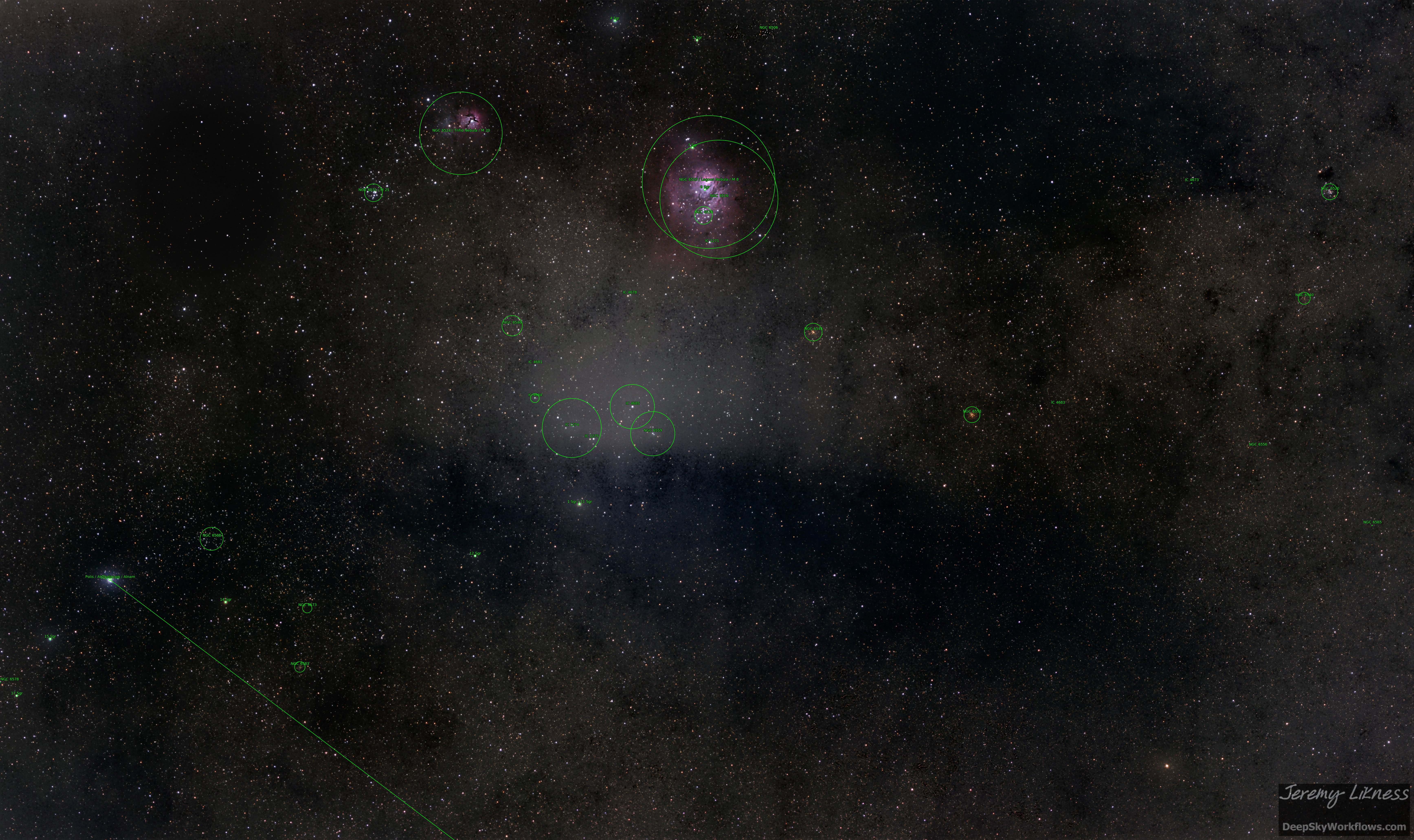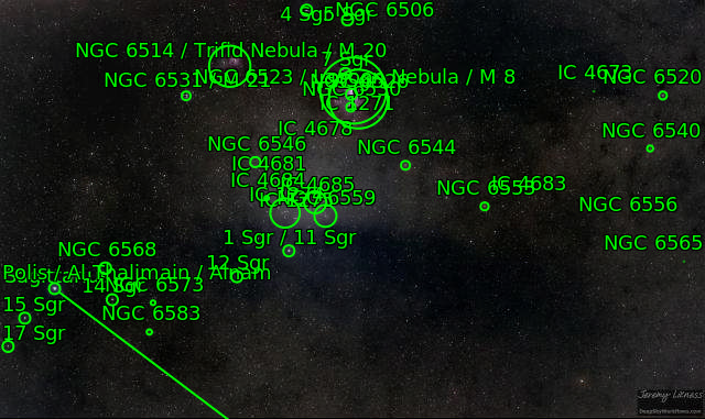 NGC6514 M20 NGC6526 NGC6523 M8 IC4685 IC1274 NGC6559 NGC6531 M21 NGC6530 NGC6546 NGC6544 NGC6568 Lagoon Nebula Trifid Nebula The star Polis Al Thalimain Alnam (μ Sgr) 13 Sgr The star 4 Sgr The star 1 Sgr 11 Sgr The star 5 Sgr The star 7 Sgr The star 9 Sgr The star 15 Sgr The star 17 Sgr The star 12 Sgr The star 14 Sgr