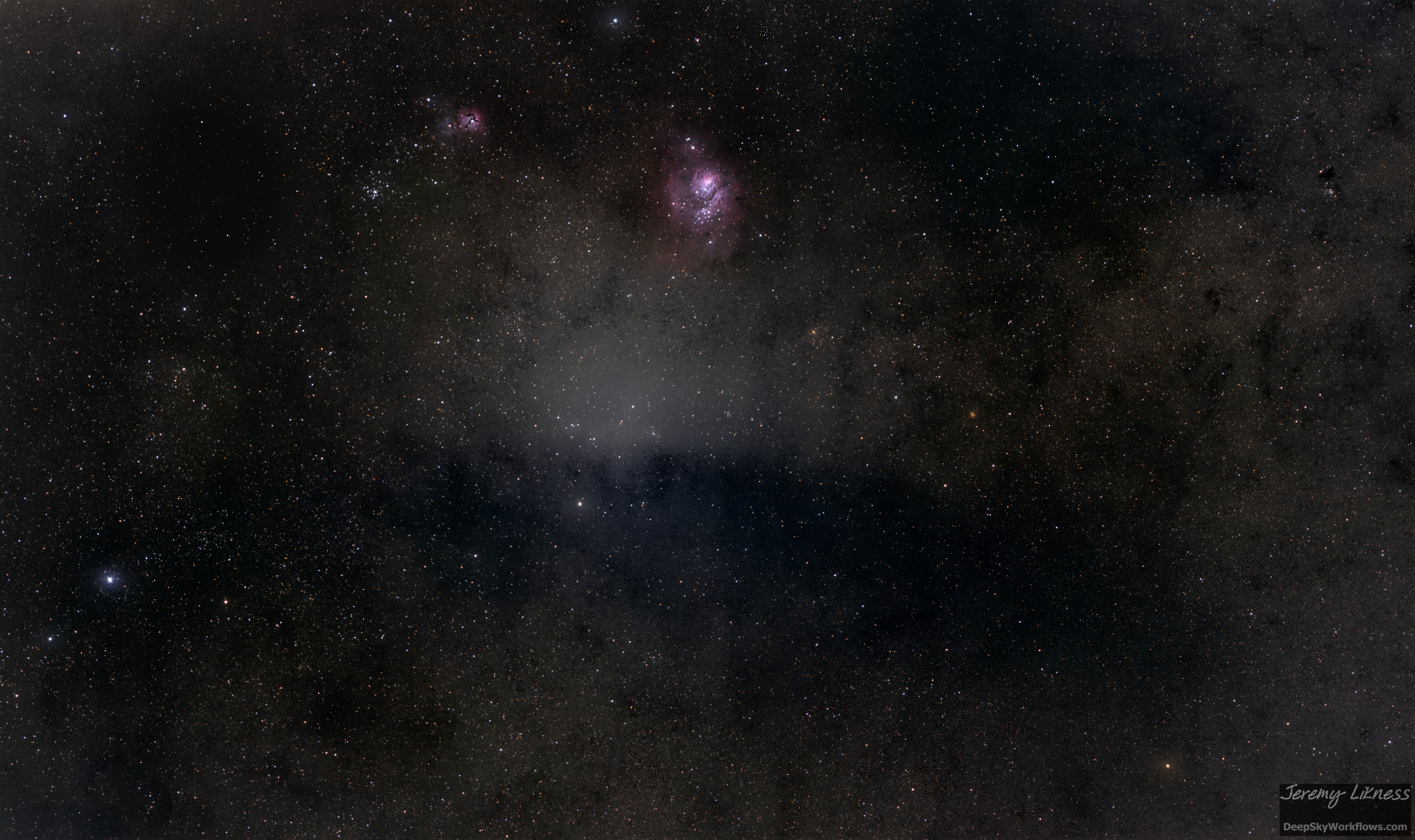 This wide angle shot taken with an unmodified mirrorless camera captures a field of view that includes the Lagoon and Trifid Nebulae (M8 and M20).