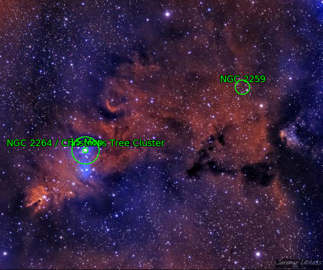 The 'Christmas Tree' is a group of stars in the blueish area lower left that form a triangle with a 'trunk.' It is oriented the same direction as the Cone Nebula, that is indeed the cone you see. There is a ton of nebulosity in the region and one glowing spot isn't a star, it's a galaxy. This is NGC2264, the Christmas Tree Cluster!