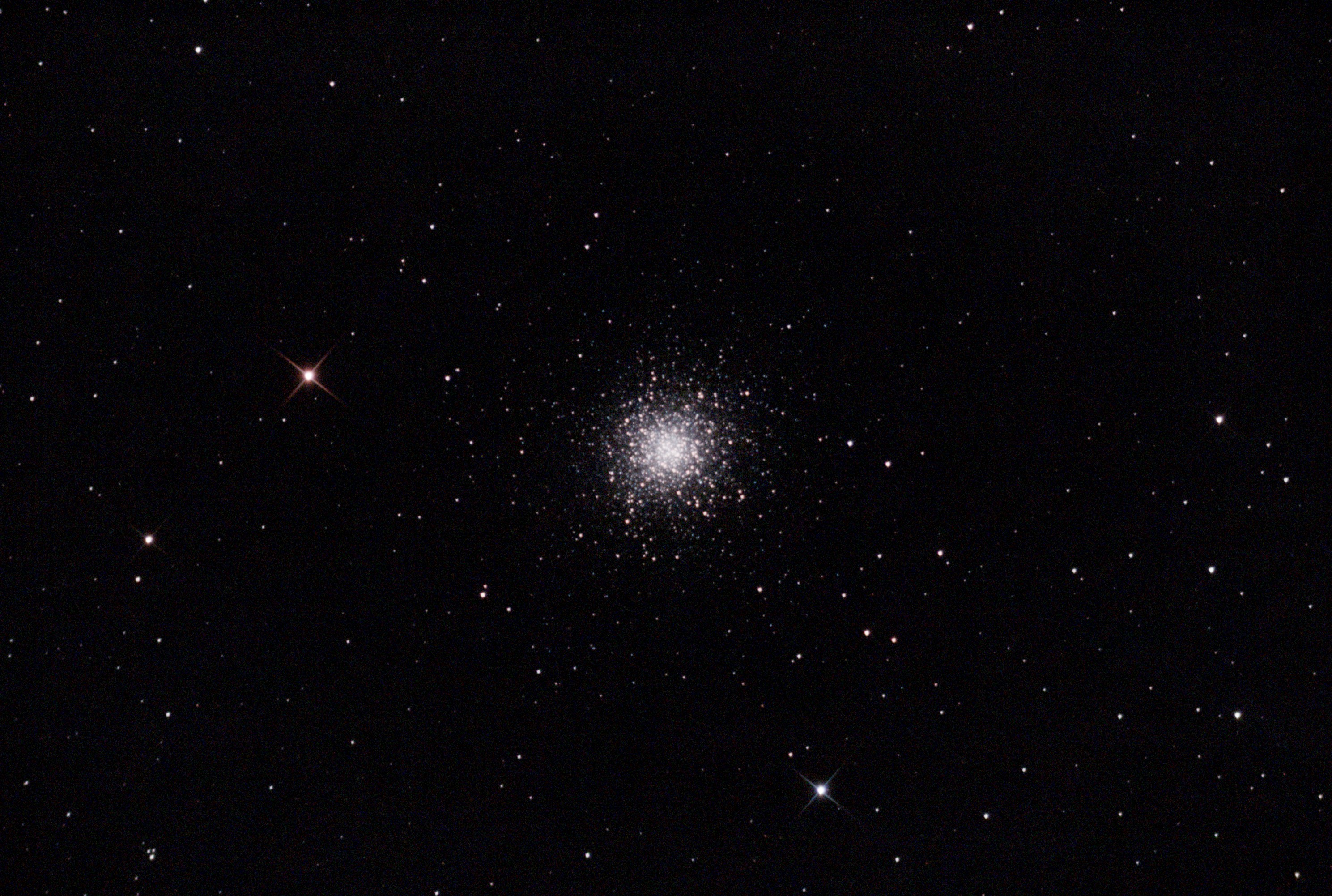 Notice the position of the cluster and orientation of the yellow and blue stars. Here’s an unprocessed frame from my telescope: